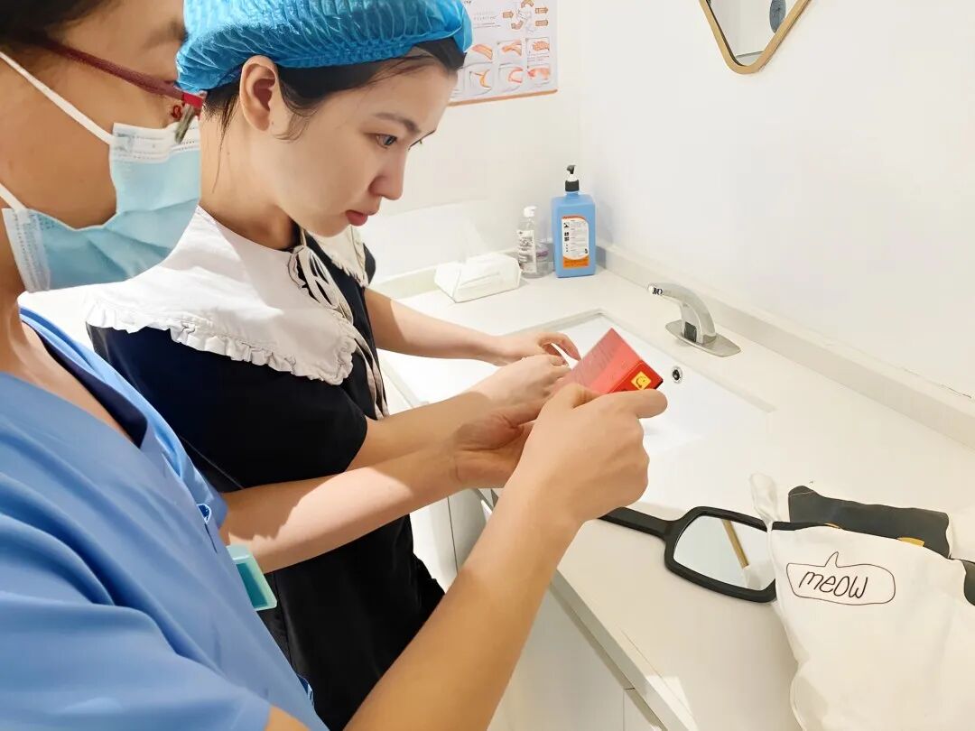 打完嗨体水光会敷一张医用面膜,促进针孔收缩恢复,同时给面部深层补水,而且敷完不用洗脸喔。(医生小贴士:打完嗨体水光后24小时内不能碰水和化妆,同时需要贴面膜给肌肤补充水分,一天一片连敷三天~)
