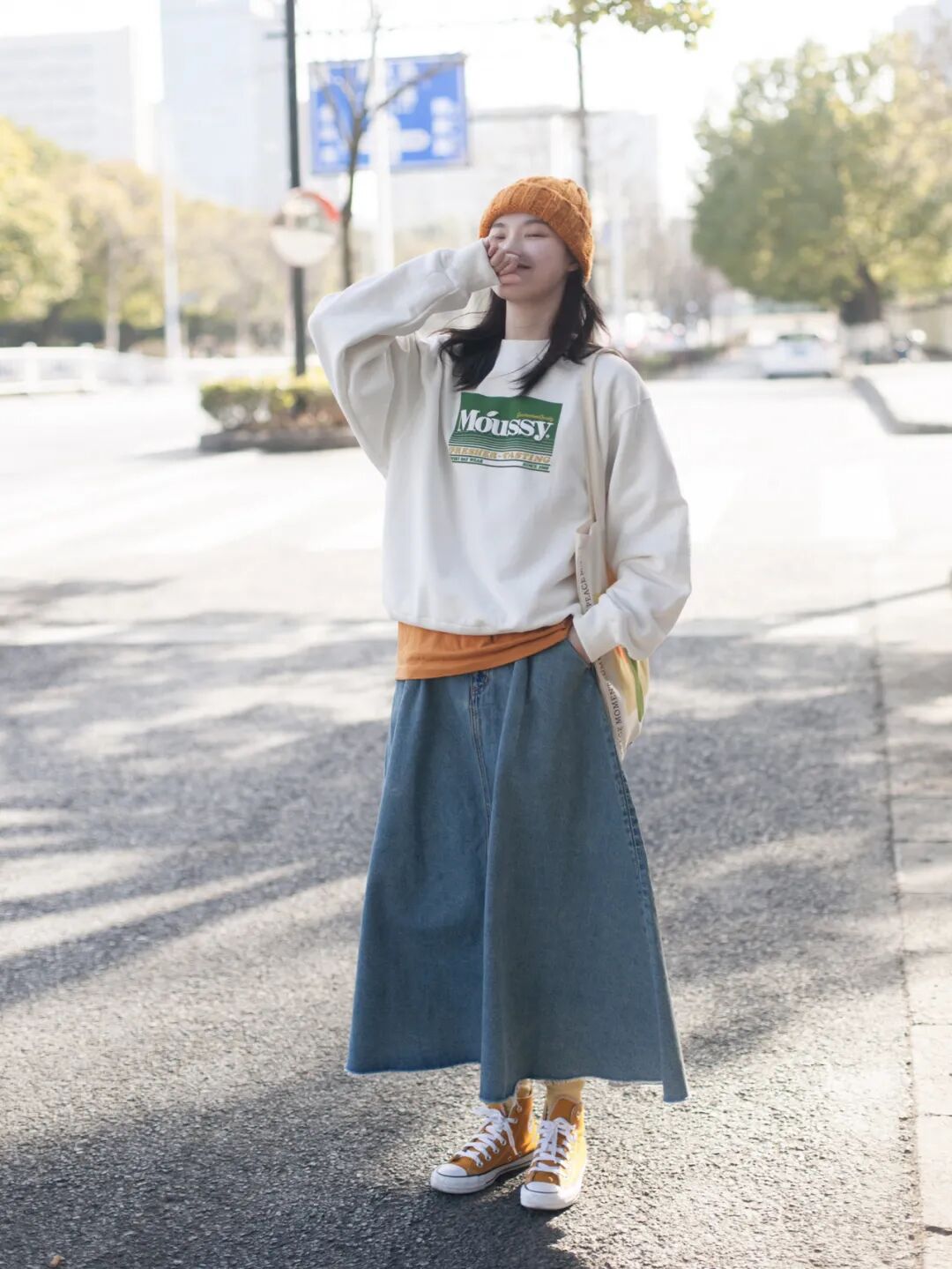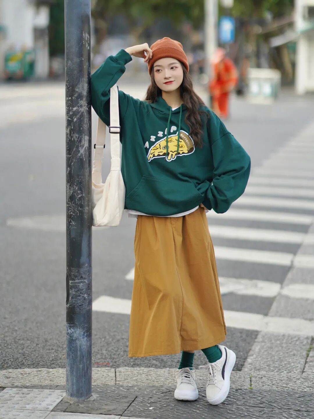 如果想要中和卫衣的休闲,给运动风加入一丝小女人味,推荐下装选择A字裙或者短裙,这两款都是遮肉藏胯的好搭档!(别说怕冷!这些裙子底下都可以藏“秋裤”的)