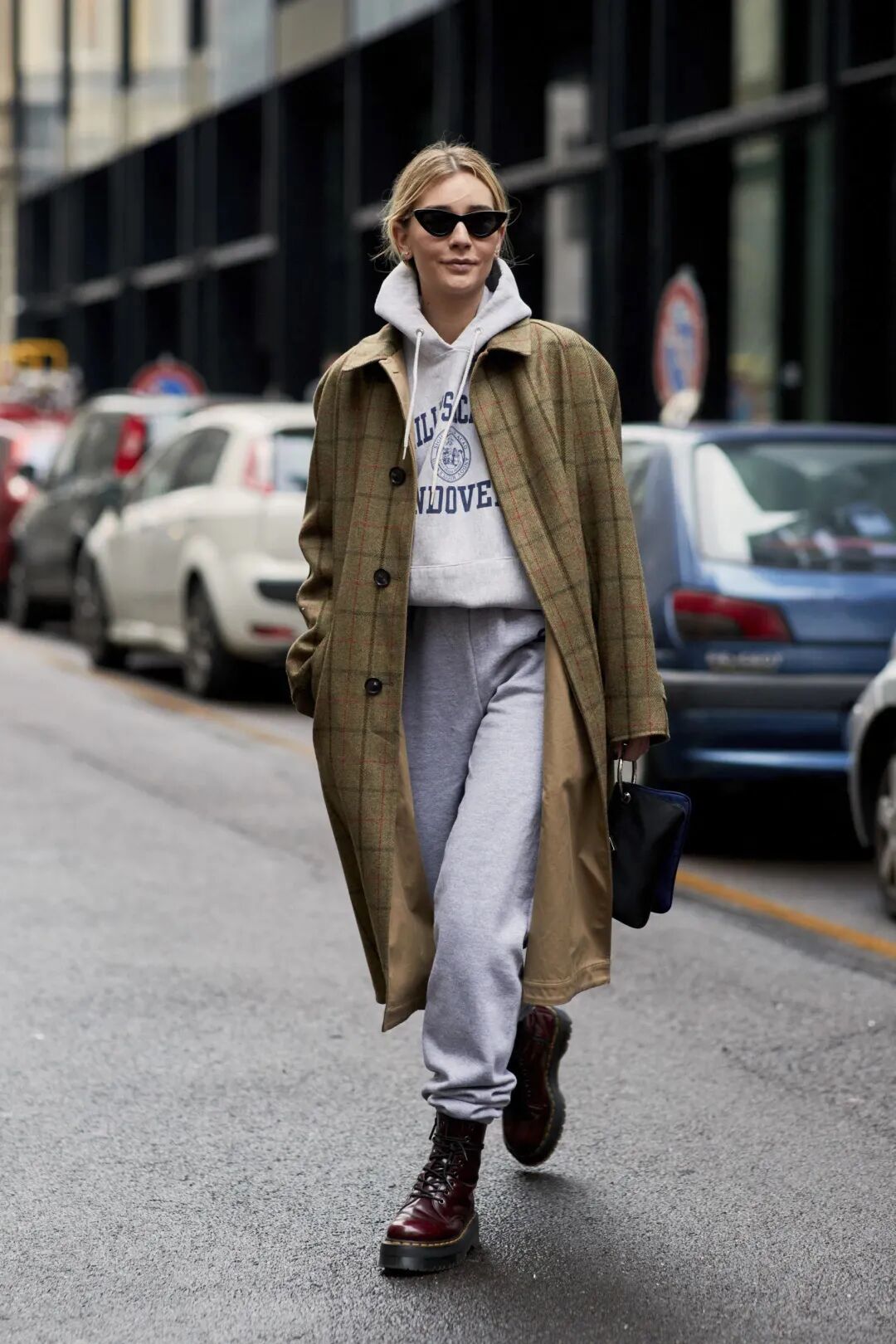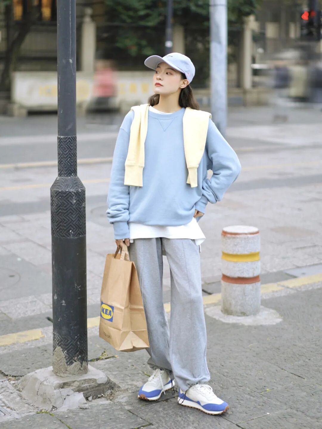 而想要打造倒三角形,也很简单,只需要一条束脚慢跑裤来搭配卫衣,喏,倒三角形马上就出来了👇