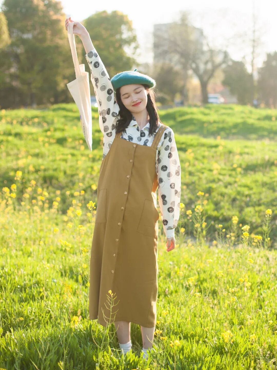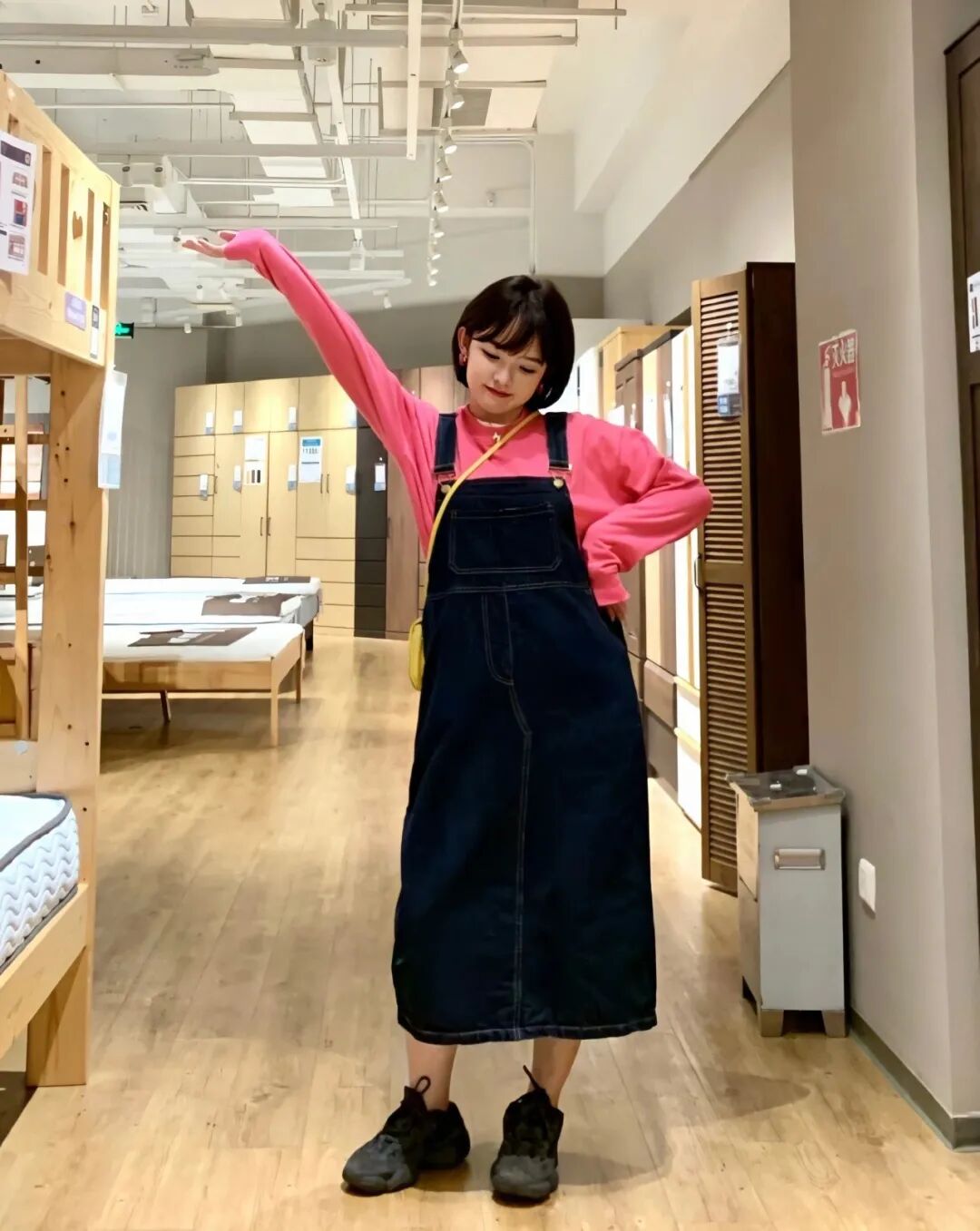 其实,穿背带裙会显胖,很可能是选错款式,像这种圆领的背带裙包裹着上半身,加上秋冬的衣服就会把上半身显得很壮实。