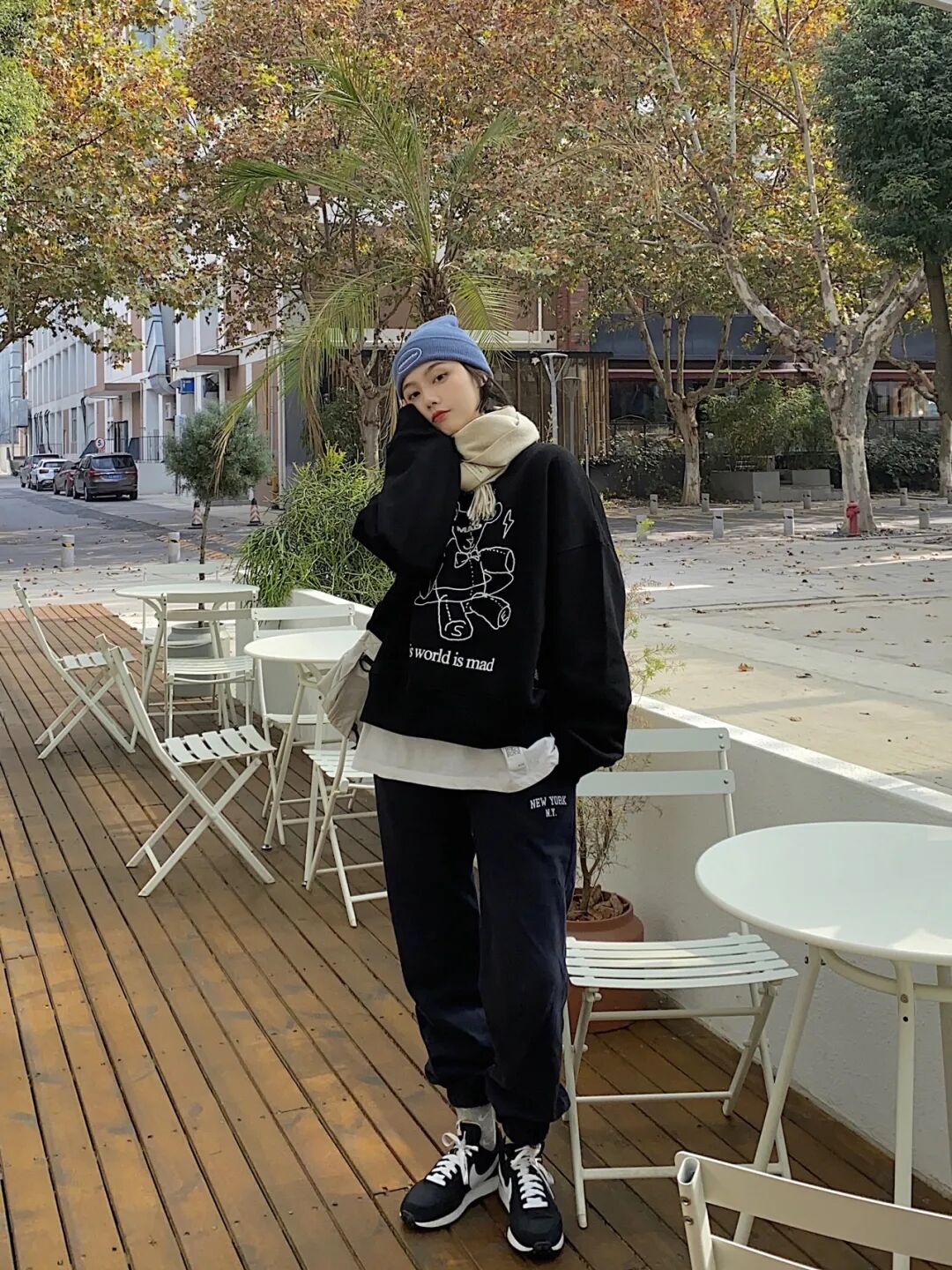 即便是选择了稍微宽松的oversize的卫衣,也不会显得很邋遢。