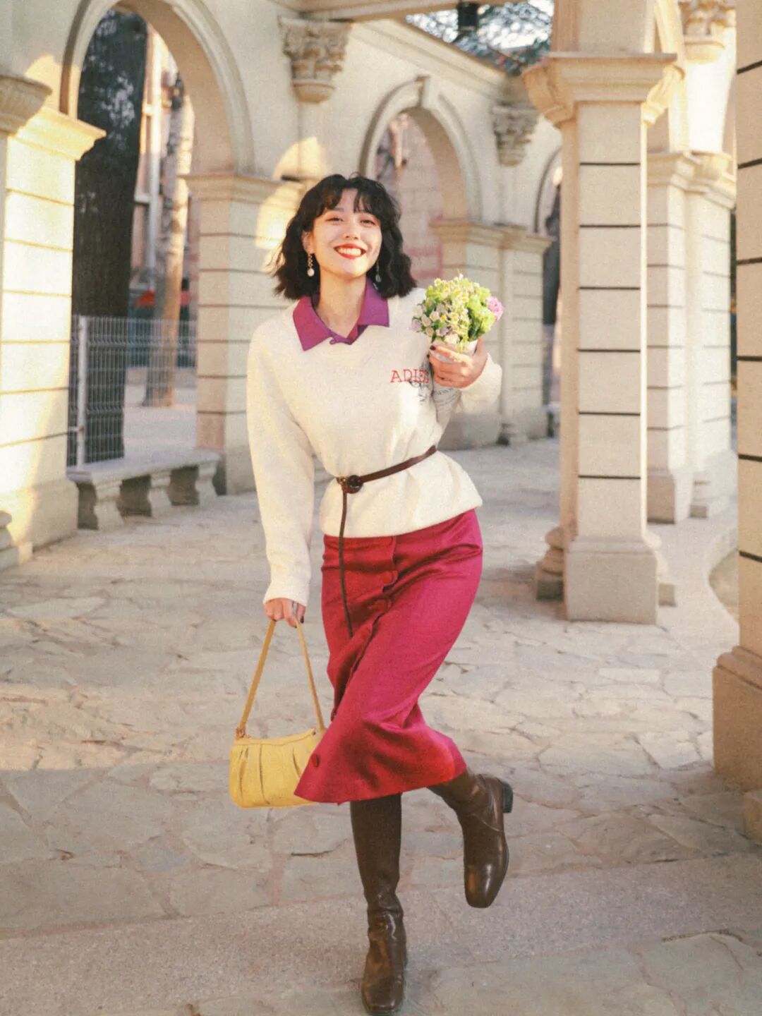 像我秋冬最常用的裙装穿搭公式:毛衣+半裙,就是妥妥的正方形+长方形的搭配。