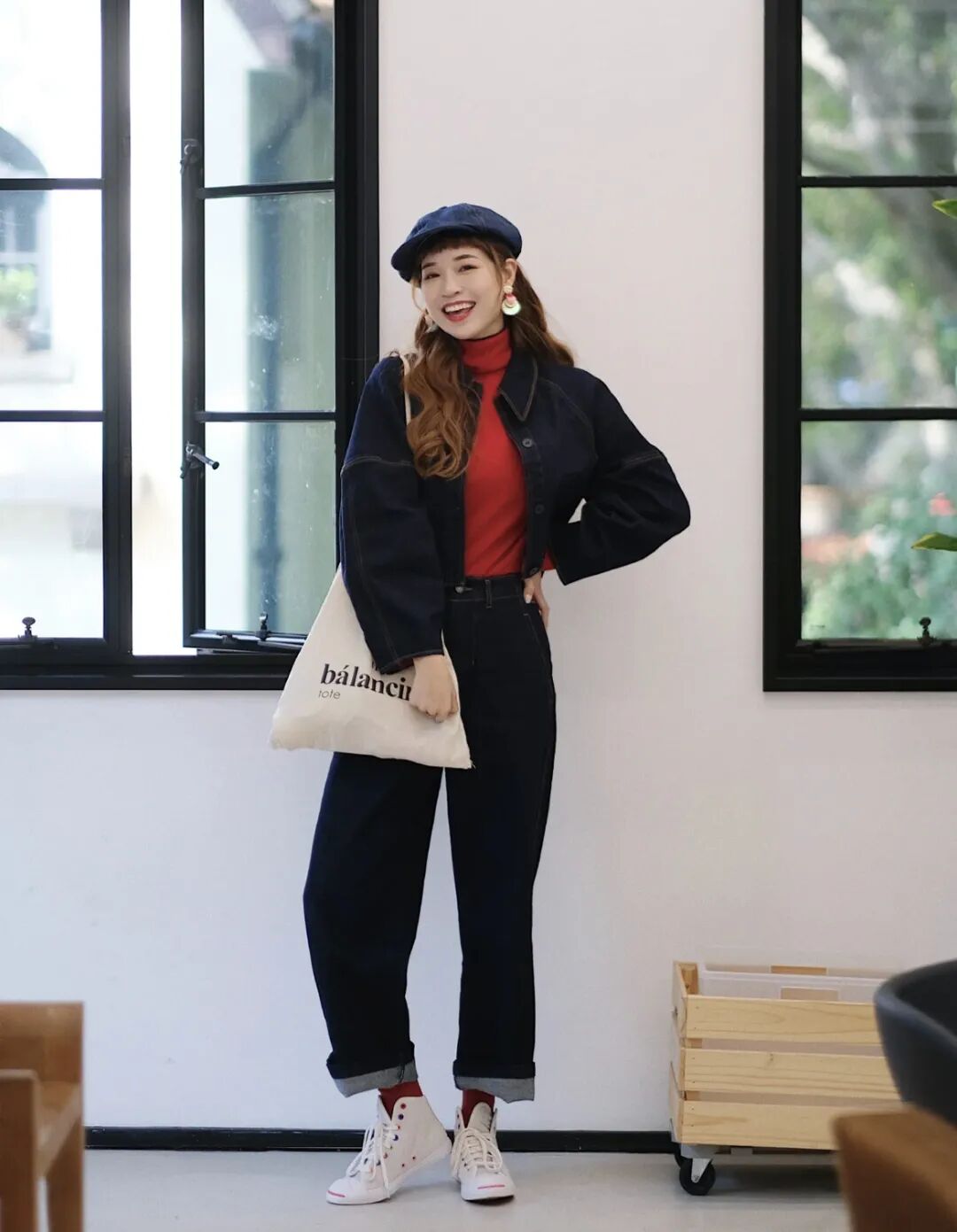 再把裤脚卷起来,露出脚踝,顺带用袜子做个颜色呼应,是不是还有点穿搭博主的feel了~