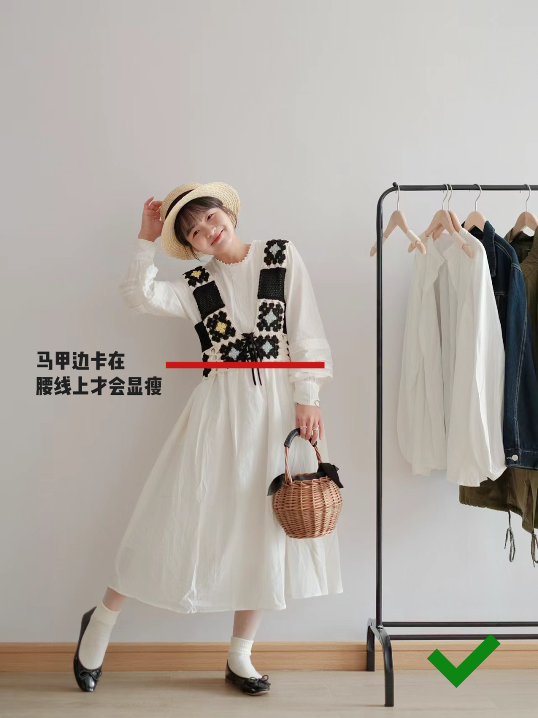 不过,如果是不收腰的连衣裙,要记得马甲的衣边要刚好收在腰线上才会显瘦。