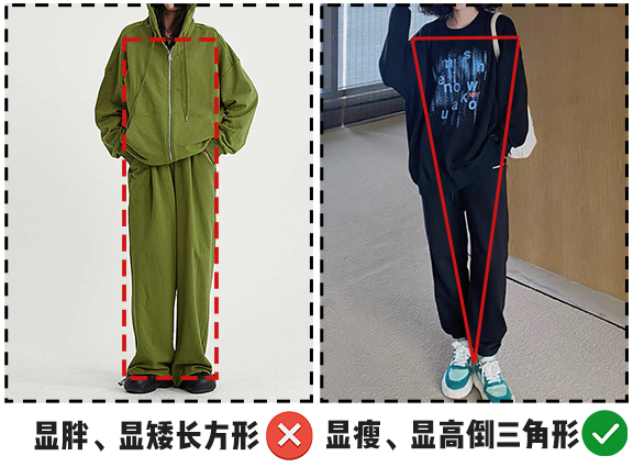 倒三角形是穿搭中常见的黄金几何图形之一,相比全套的长方形,倒三角形可以让我们在穿宽松单品的时候更加显瘦显高。