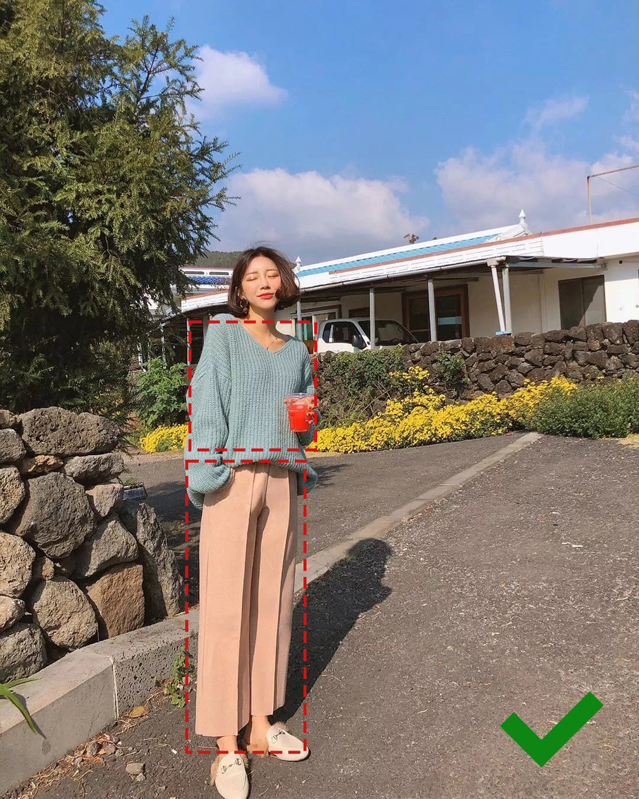 至于下装搭配,同样只需要拿捏黄金几何图形搭配,不过这里不是倒三角形,而是正方形+长方形原则。