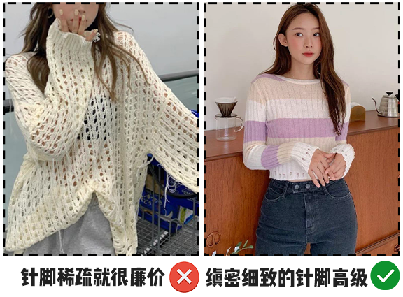 不过,细针毛衣千万不要选择针脚稀疏的款式,很容易显low,没档次。