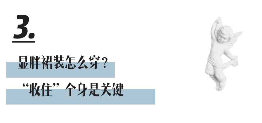当然,也不要忘了裙装在秋冬穿其实也会有显胖的问题,像上半身量感重、没有腰线都容易把裙子穿得显胖。