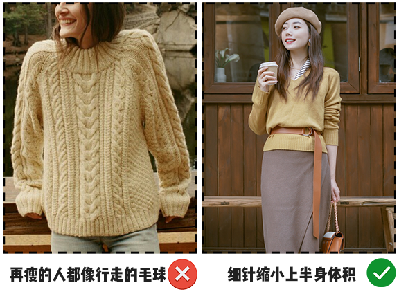 像粗棒和麻花织线的毛衣厚重感强,不是瘦条的姐妹就很容易穿得跟堵墙一样厚实。