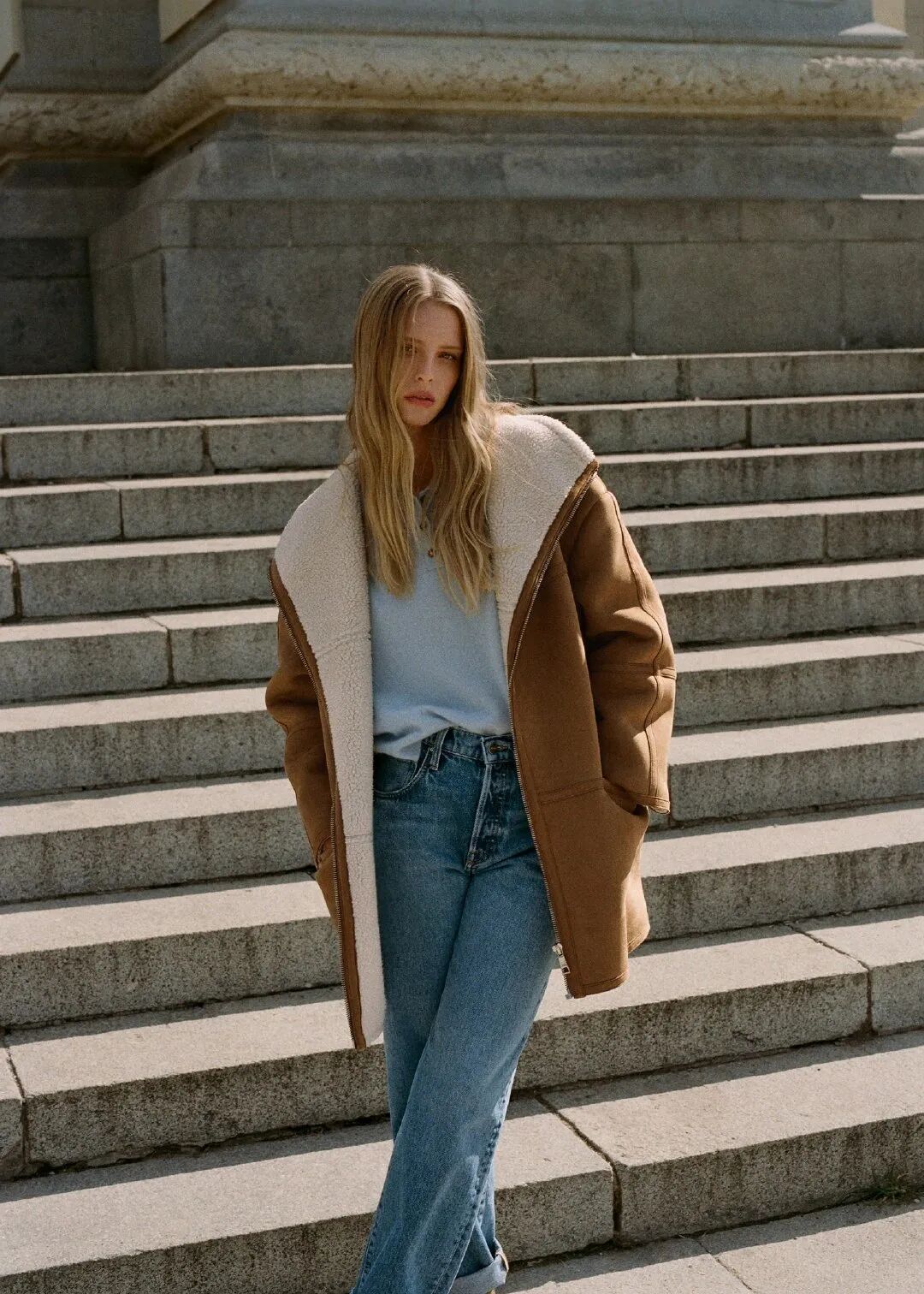 想要更保暖效果和时髦感兼具的姐妹,强烈推荐这种皮毛一体的外套,经常出现在《fudge》经典复古的造型中,下装只需要搭配牛仔裤就不容易穿得臃肿。