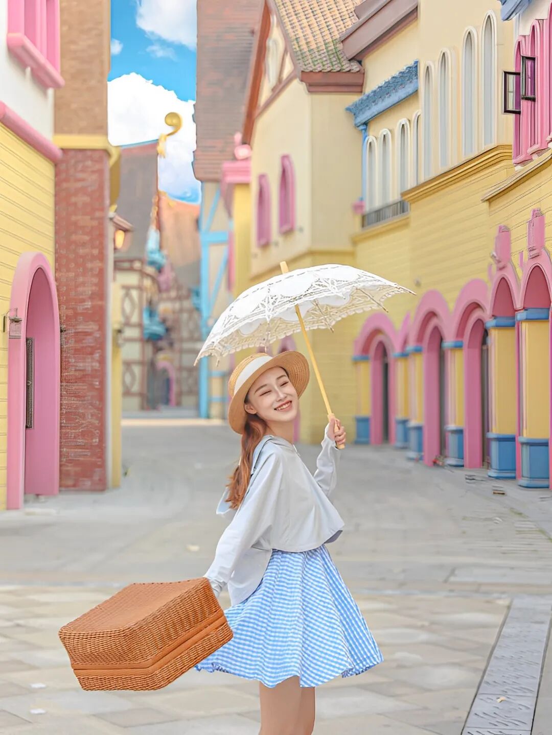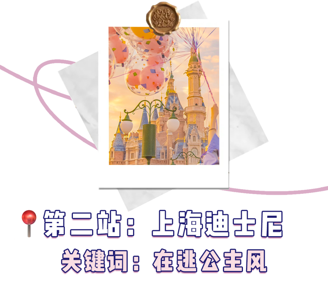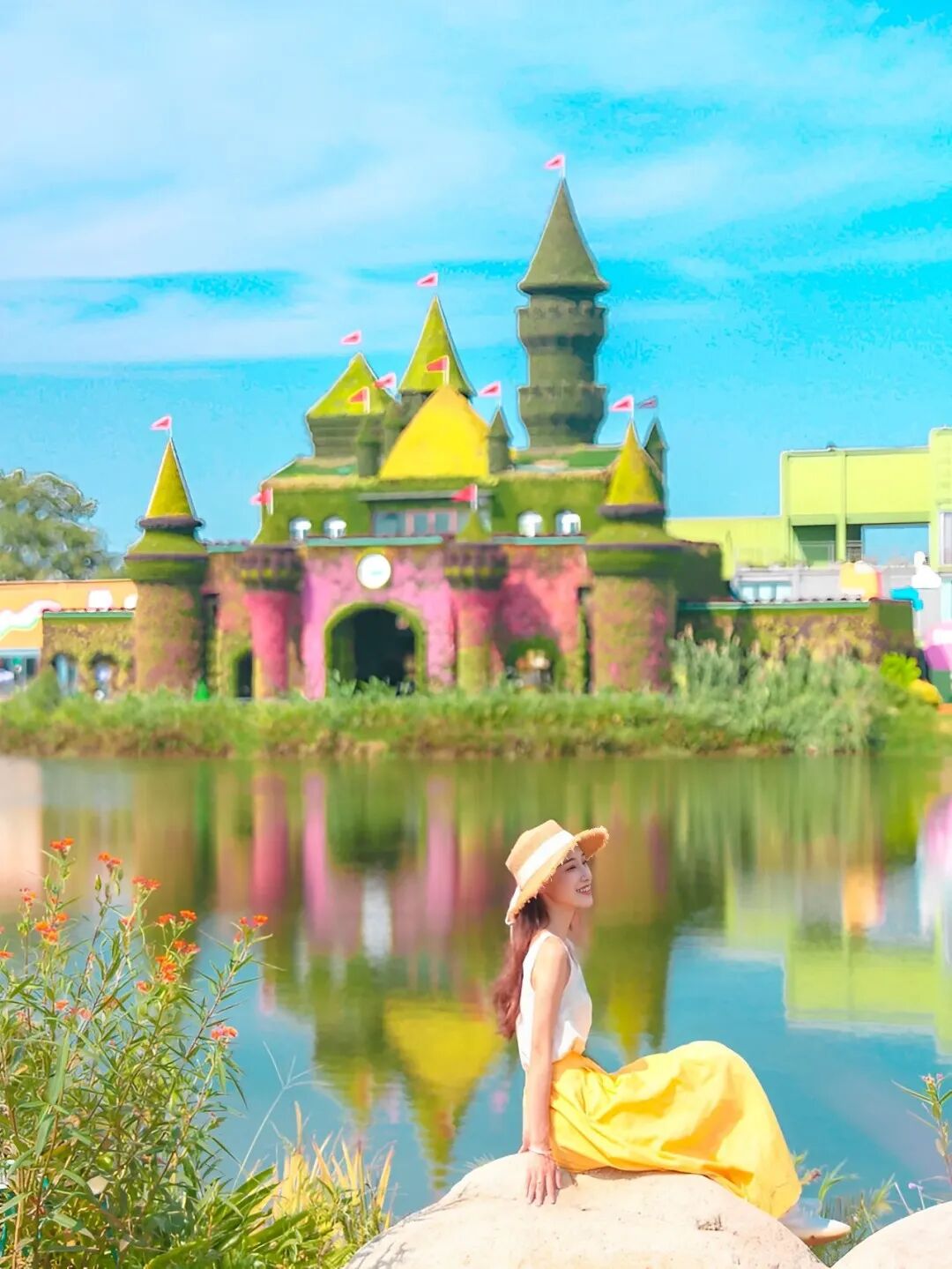 告诉姐妹们一个上镜tips:整个乐园主色调都是粉蓝色,所以选取马卡龙色的裙子拍照会更好看~