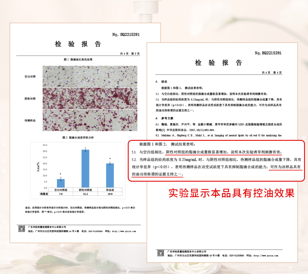 直接送去检测,把别人都没有的控油检测报告做完之后po出来给大家看:有抑制脂滴合成的能力!
