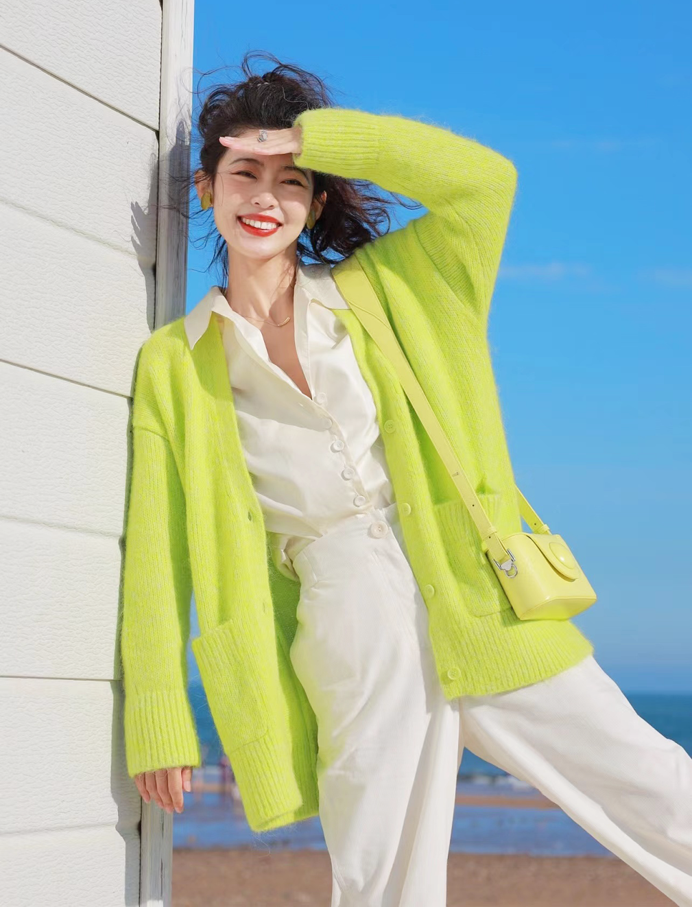 不过记得领口不能拘谨,要多选择宽松、V领的设计,塑造横向的视觉效果,不然再纤细的上半身也显胖了。