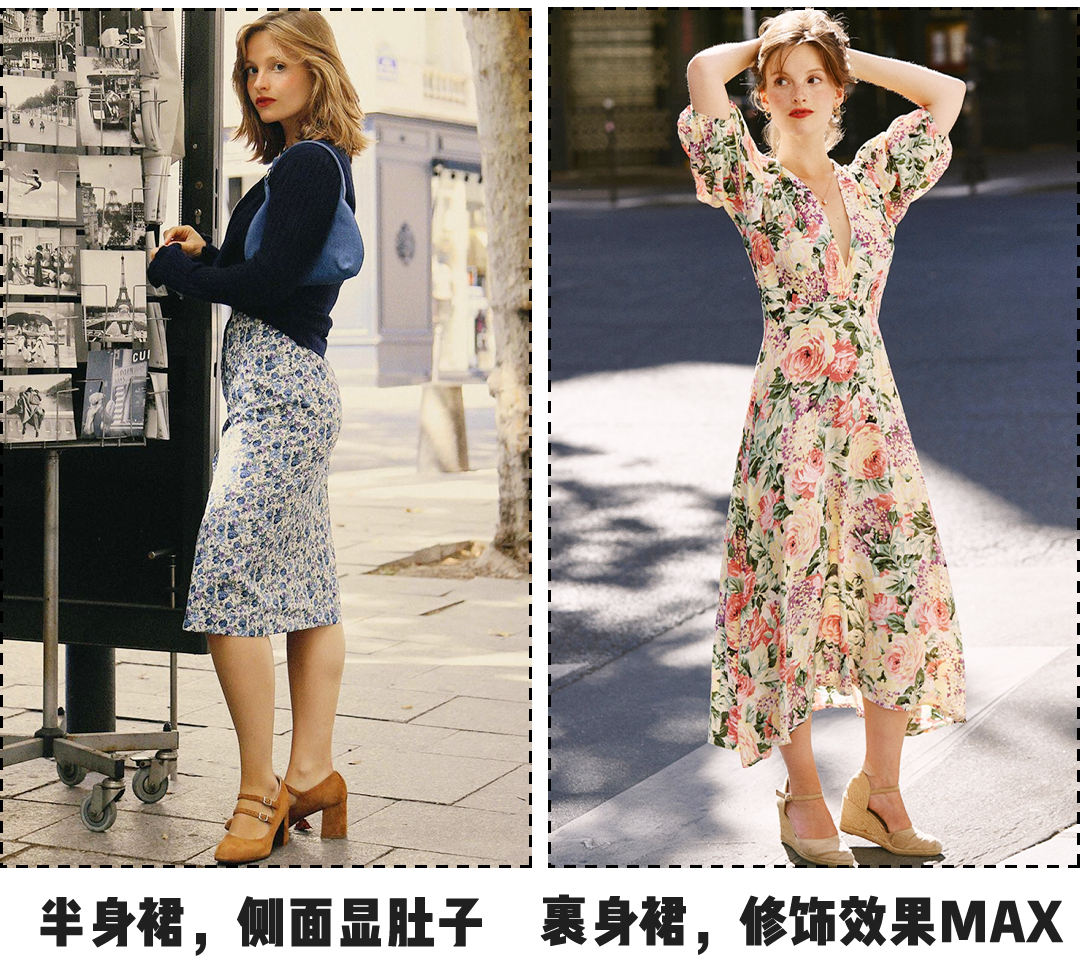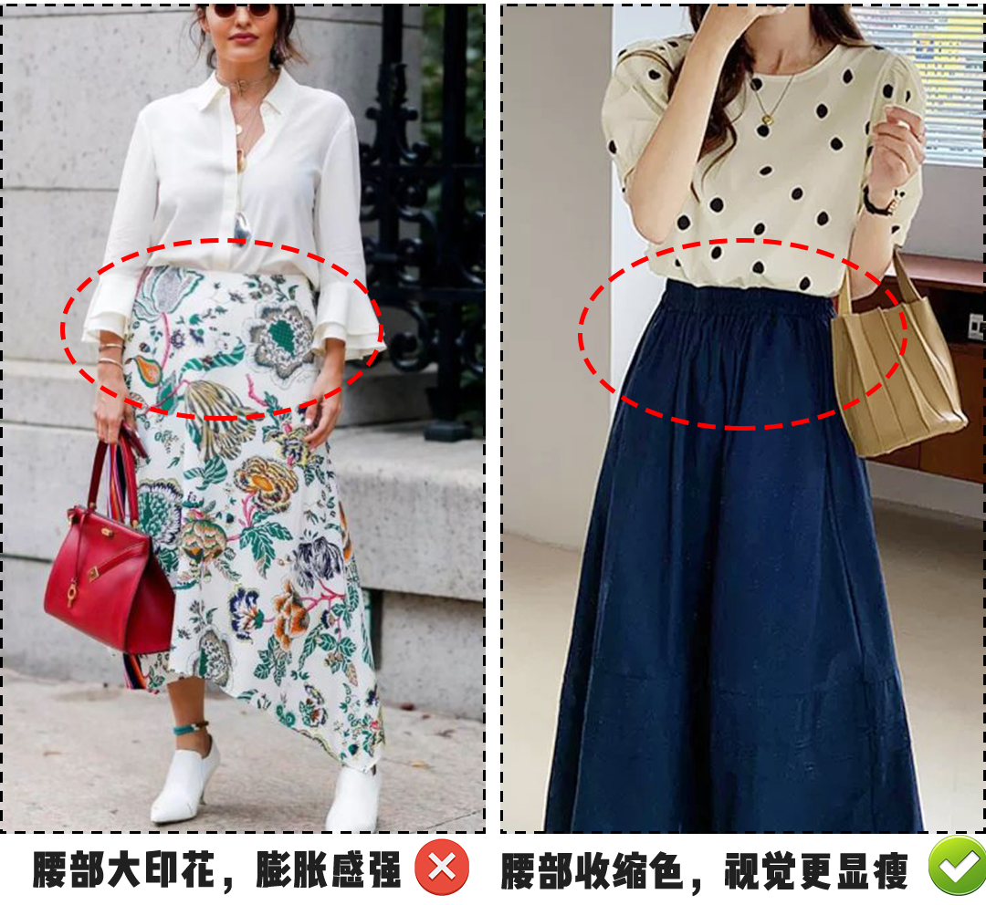 如果非要穿半身裙的姐妹,切记腰腹位置最好是为深色,图案简洁的。