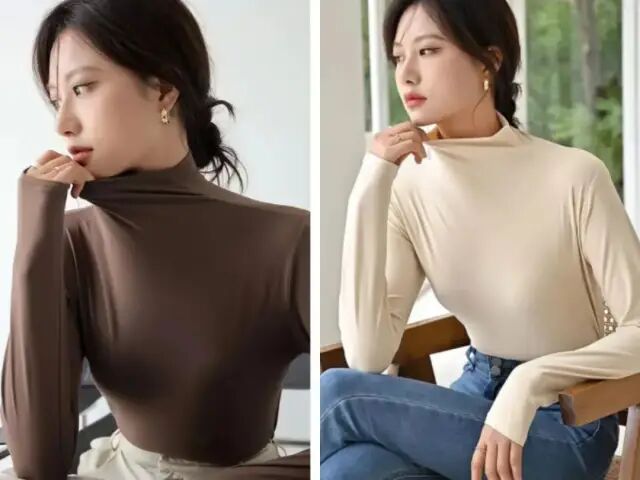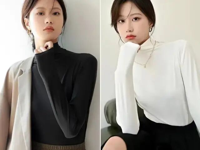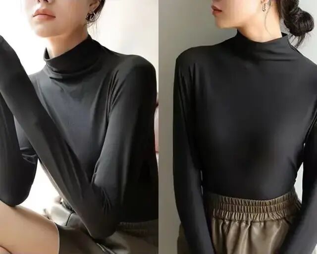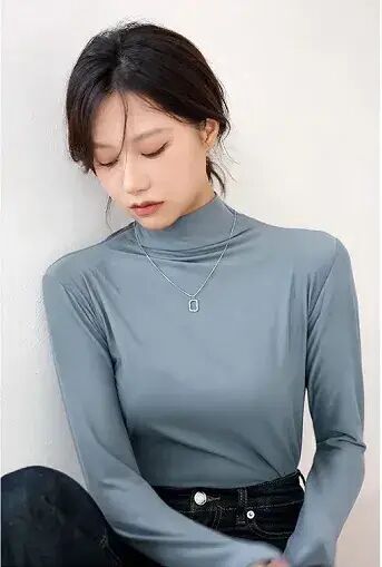 不仅如此,这款打底衫不是高领,而选用中领的设计,刚好处于脖子中间段、露出一小部分颈部皮肤,既够高领的潮流感,也不会显得没脖子。