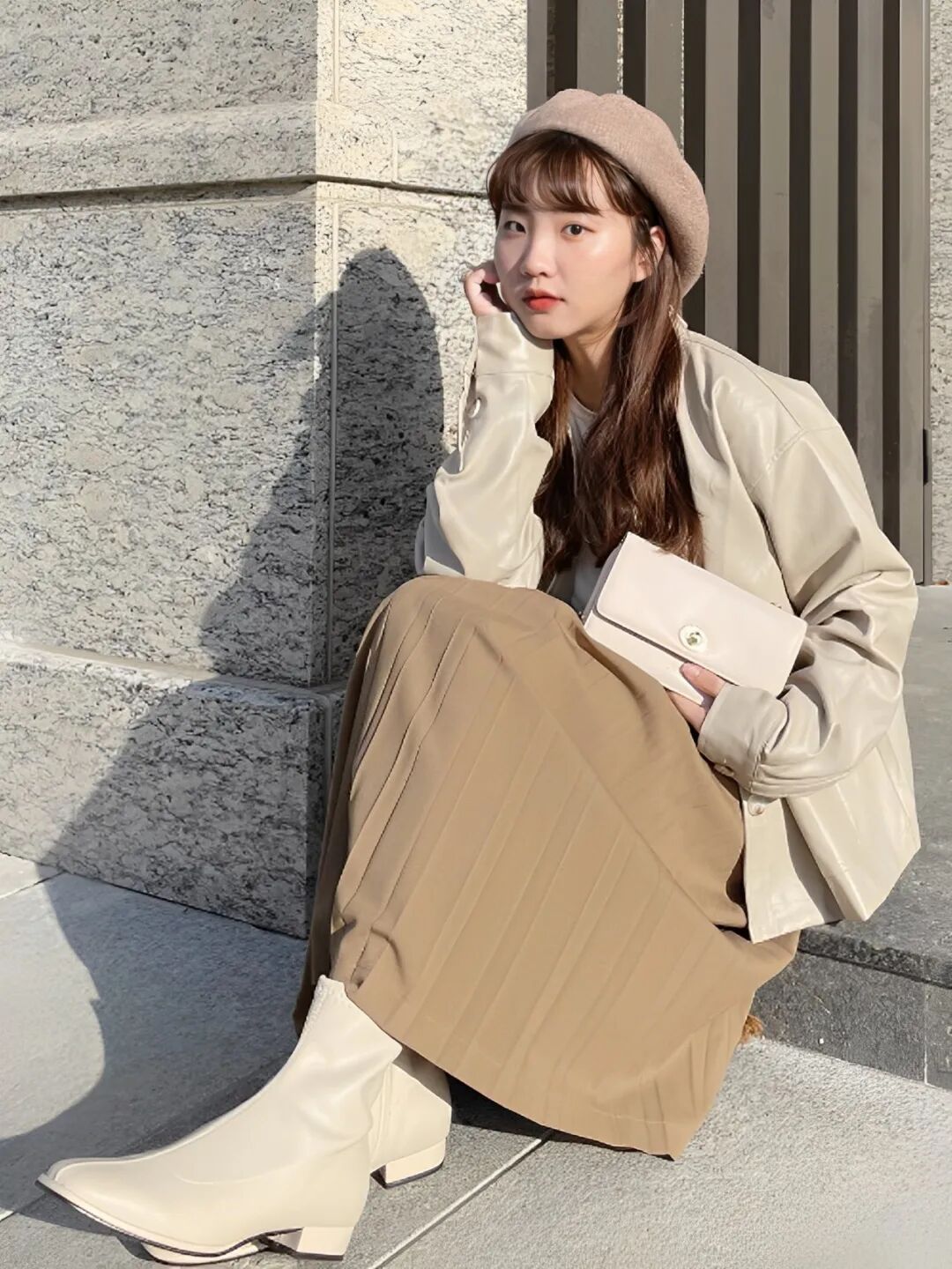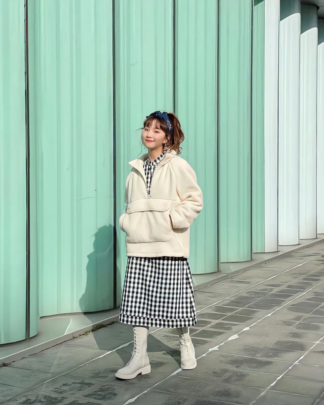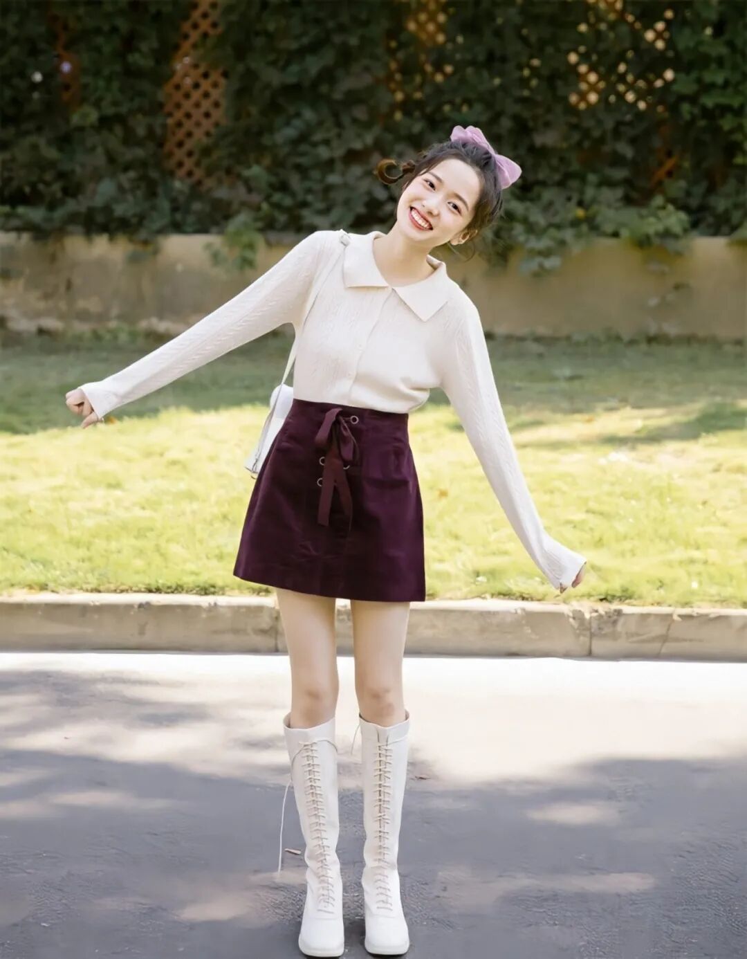 哈哈当然不是,解决办法姿佑已经帮我们试出来了,那就是——穿裙子+靴子👇