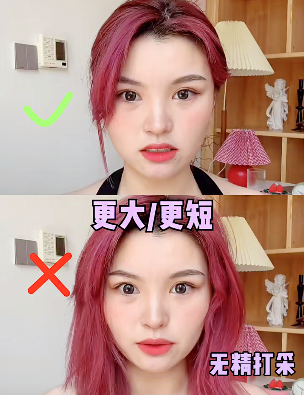 其实这都是发型的锅!很多姐妹特别喜欢用披头散发来遮脸,觉得会显脸小。自拍时这个思路没毛病: