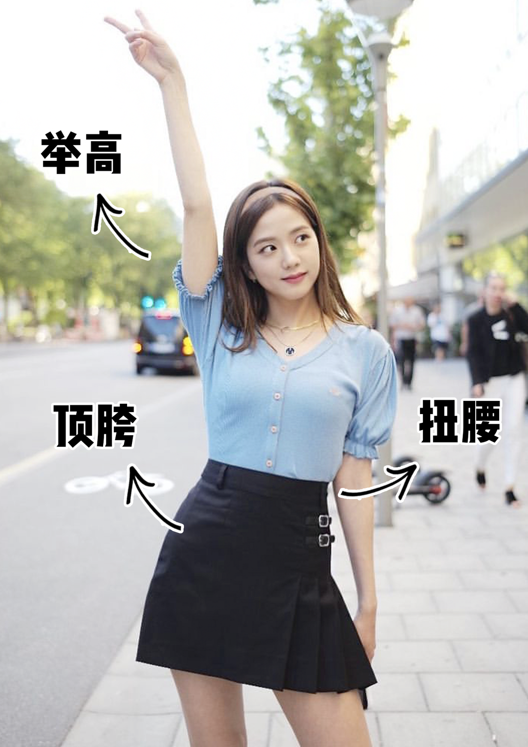 JISOO演示:一手伸直举高,顶胯,扭腰👇