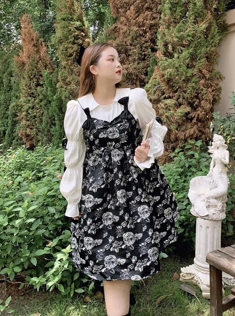 杏白色的背心裙上印着盛开的盆栽,犹如把画家精心作的画穿在身上,好不浪漫~