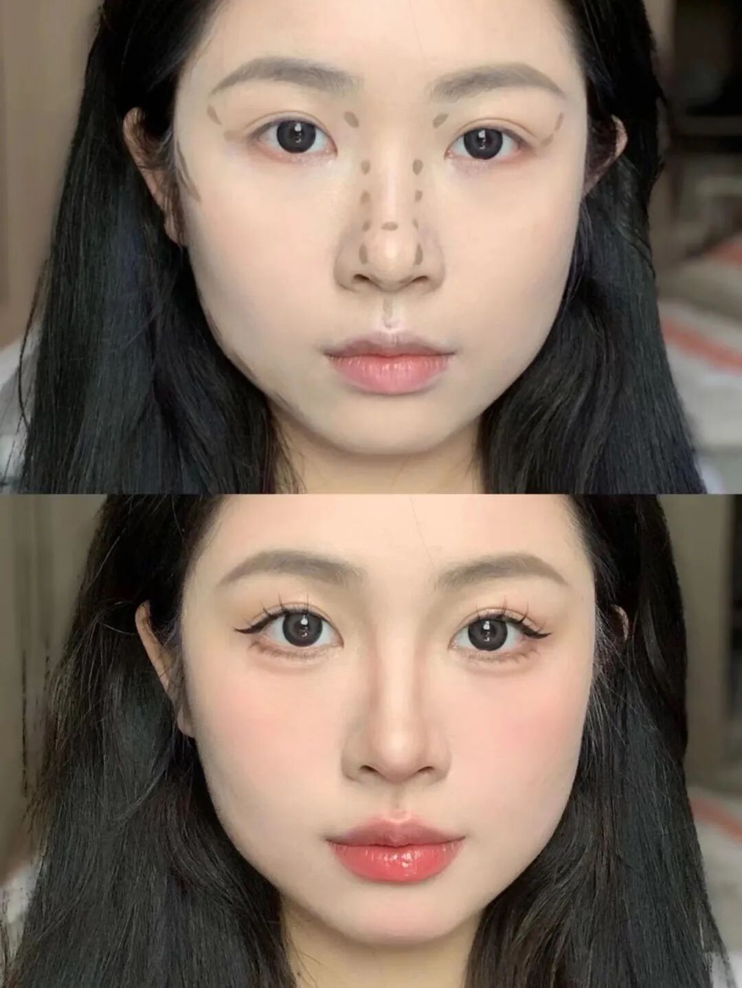 对于鼻梁修容其实满简单的,记住公式:山根重、鼻梁轻、鼻头重👇
