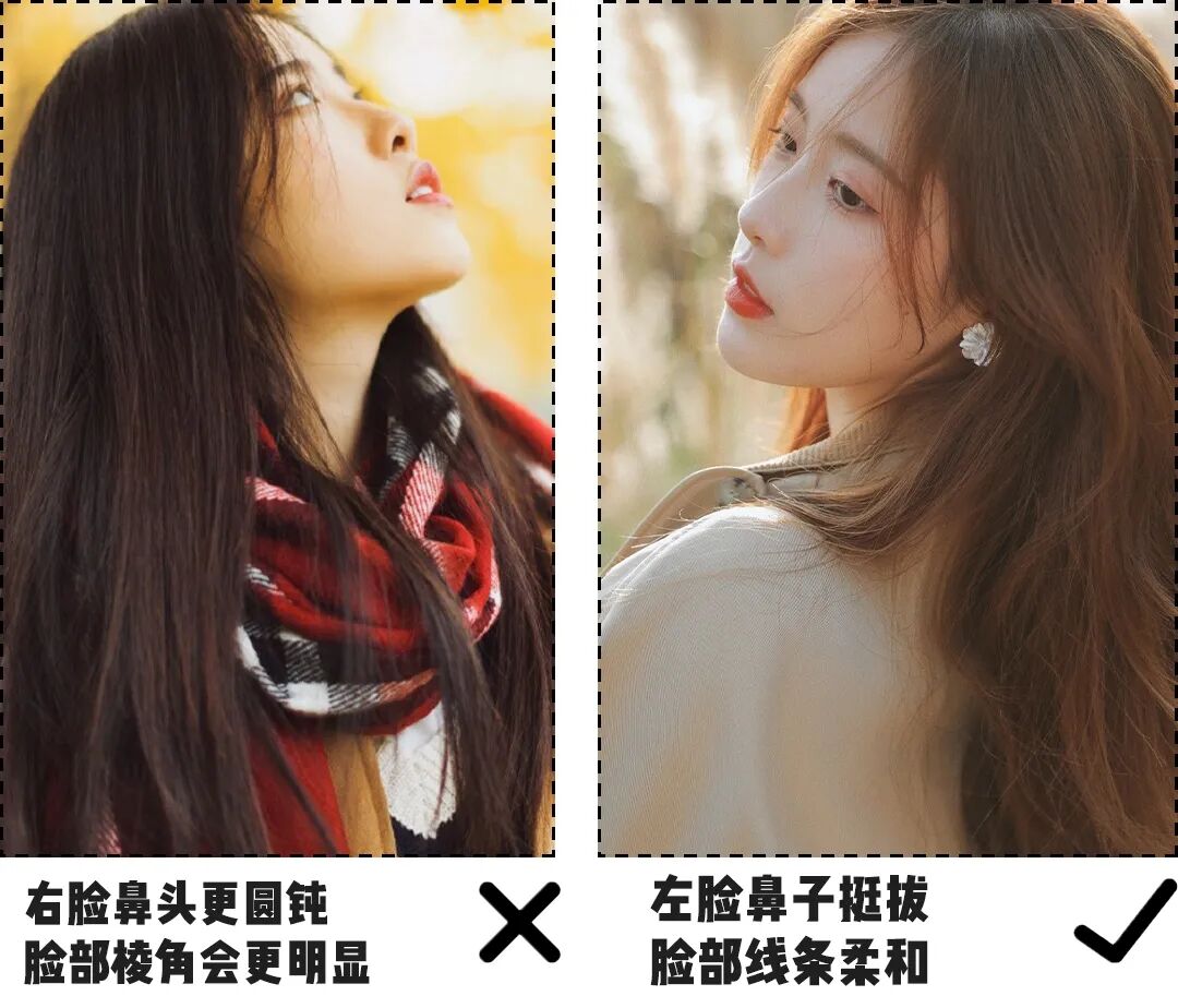因为我们每个人其实都有点大小脸,把好看的一边脸侧对镜头拍摄,在视觉上脸会比正面小1/4。