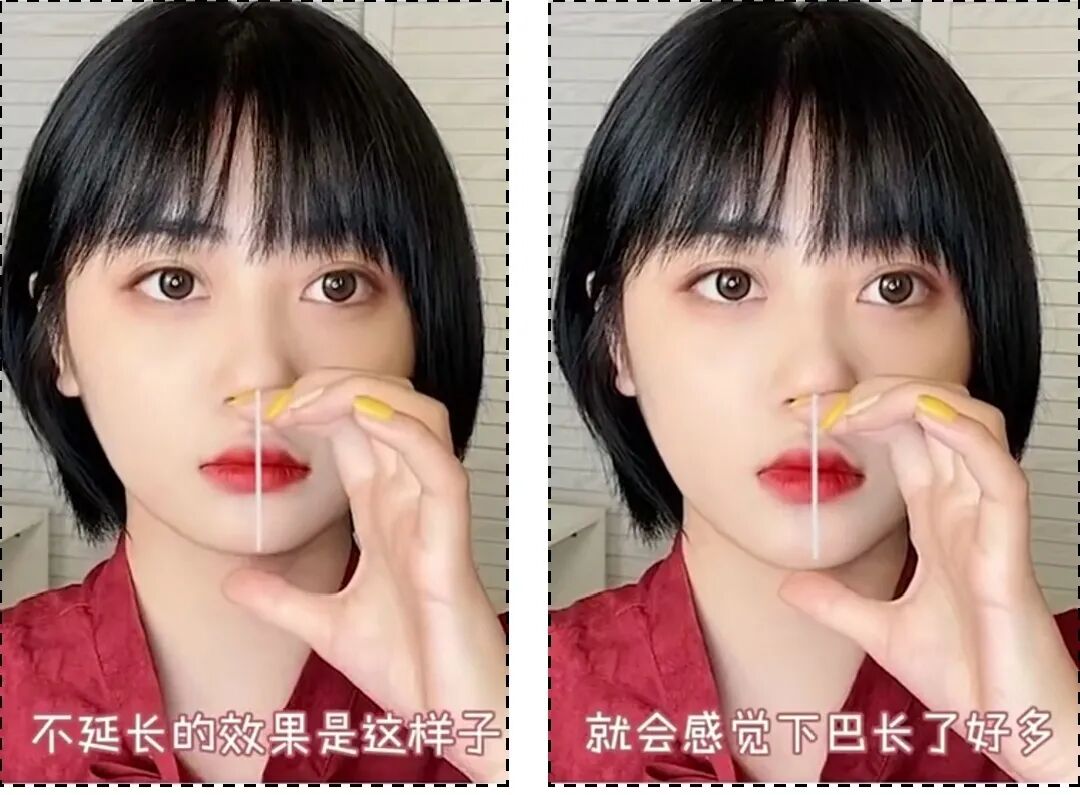 拍照时可以用舌头顶住上颚,想象下巴去找锁骨的样子,会有延长下巴的效果,三庭五眼就会更协调。
