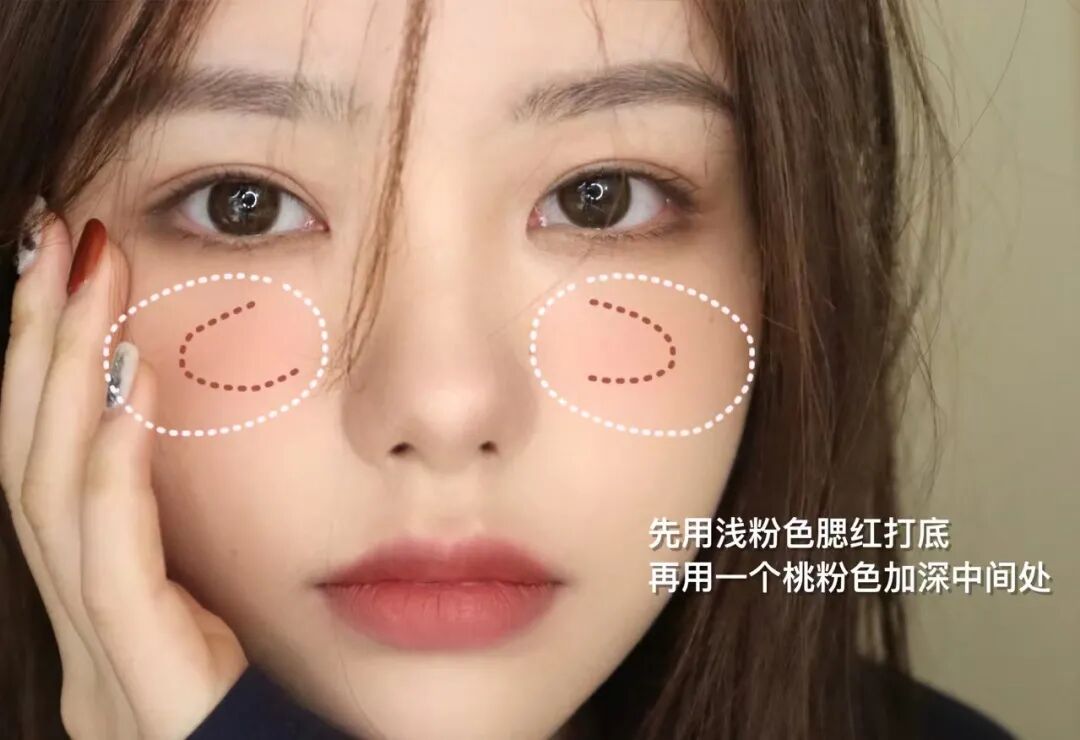 想要打造从皮肤里透出来的气色,可以先用浅粉色腮红打底,再调一个桃粉色加深中间处👇
