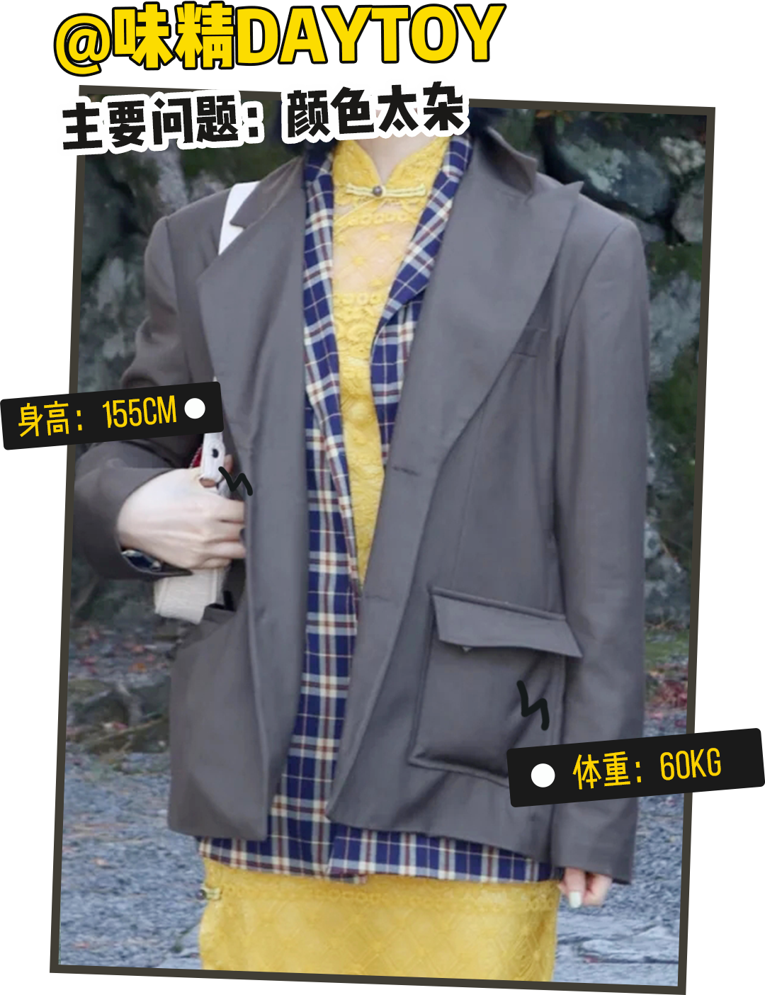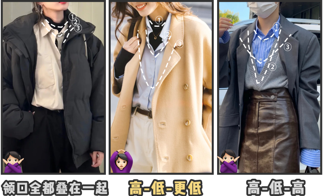 我们能看到这位姐妹叠穿顺序和厚薄都没有错,好像没什么毛病,其实问题就出在领子上!👇