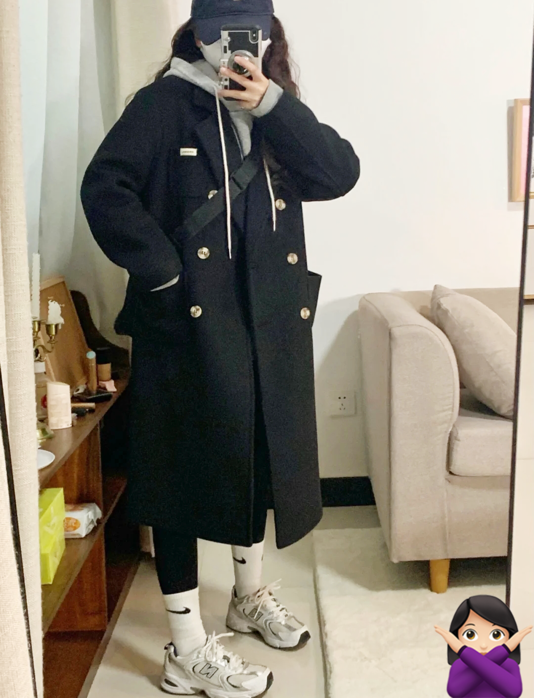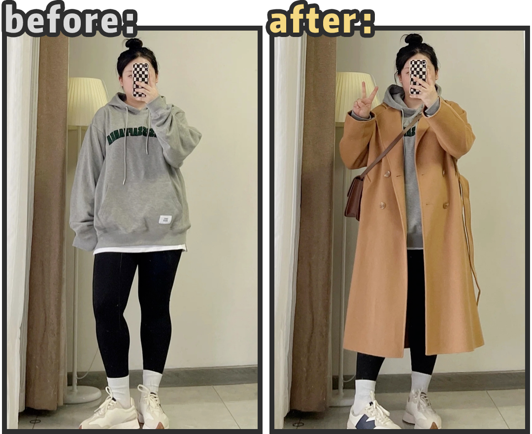 叠穿显臃肿是最多人遇到的问题,就像这位姐妹,其实就是模仿去年就开始流行连帽卫衣+大衣的叠穿方式!