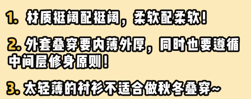 到这里可能有姐妹就会疑惑:我上半身就是按照中间薄的规则去穿的,为啥还是显臃肿?那是因为上半身叠穿对了,还要注意👇