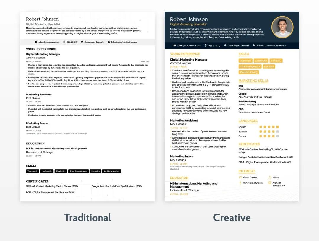 除非你要申请研究型硕士、博士,或者公司的技术岗位和重要的岗位,需要体现你的学术经历、获奖经历、项目经历、工作经历。其余,申请学校和工作,仅需一页Resume就行了,将你的过往经历浓缩在一张纸上,方便阅读。记住,无论你编辑是用的office,还是简历制作网站,最后一定要是PDF格式。常常见很多同学搞成Word形式,不同软件打开后惨不忍睹,一片乱码……无论你是选择下方左侧传统的排版,还是右侧非常新颖的排版,都可以!但是两个都有统一的特点:排版整齐、一目了然,知道一个人的所有信息,不会漏掉任何部分。这才是一个完整的Resume。排版整齐的小窍门是:正文字体统一、字号统一、行间距适中、标题和副标题有格式区分、适当的页边距。电话:如果是中国电话记得+86。如果是澳洲电话就不需了,但是一定要记得开头为0!邮箱:邮箱推荐用Gmail,不要用qq邮箱,邮箱以“名字.姓氏@gmail.com”不要“名字0613@gmail.com”,例如:vivian.qin@gmail.com地址:你需要收发信件的话就写详细,一般不需要太详细的,因为也属于隐私,仅显示所在的国家、省/州、城市即可。签证:因为签证形形色色,所以求职时你最好把你的签证类别写上去,如果你的签证到期时间很短,你可以不写。申请学校的时候,学校需要知道你的签证类型。照片:任何审理的人并不会看重你的长相,并不需要贴上你的照片背景:无论是你的国籍、政治、宗教、婚姻背景,都不需要写上去。Resume Summary是对你整个生涯的概括,2-3句话即可,适用于经验丰富的求职者。你需要描述你的相关技能、教育、认证,在工作中获得了什么样的成就,将会为公司带来什么效益或者每天能处理多少事物,获得了公司和客户的青睐与肯定。在[相关领域]具有[几年]的工作经验,拥有[行业相关的]什么什么技能,为公司创造了[多少效益],或获得了公司的肯定等。