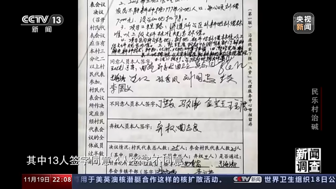 3月13日的村民代表会议总共21个村民代表参会,其中13人签字同意,4人签字不同意,还有一人签字弃权和三人没有签字,视作弃权。至此,民乐村土地整理项目终于按规定走完了“村级重大事项民主决策制度”的全部流程,可以招标开工了。2016年8月,施工终于开始了,可此时,村民们的心里却依然惴惴不安。