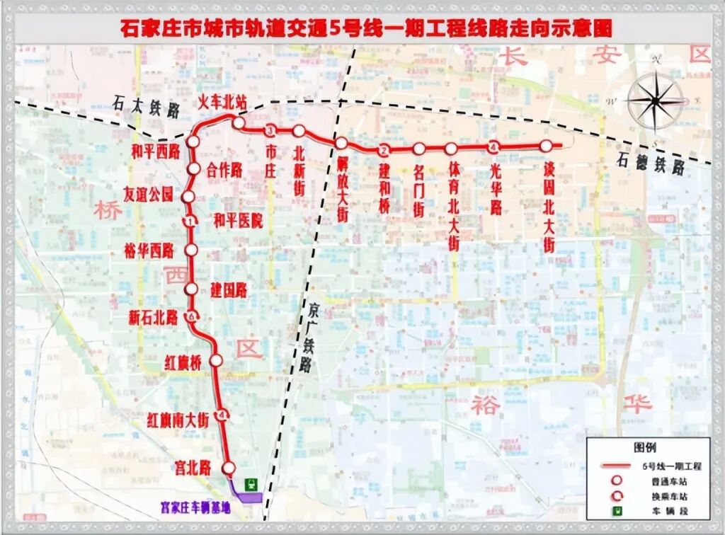 石家庄市轨道交通5号线一期工程线路全长约19.9公里,共设车站19座,平均站间距约1.07公里,设宫家庄车辆基地一座。