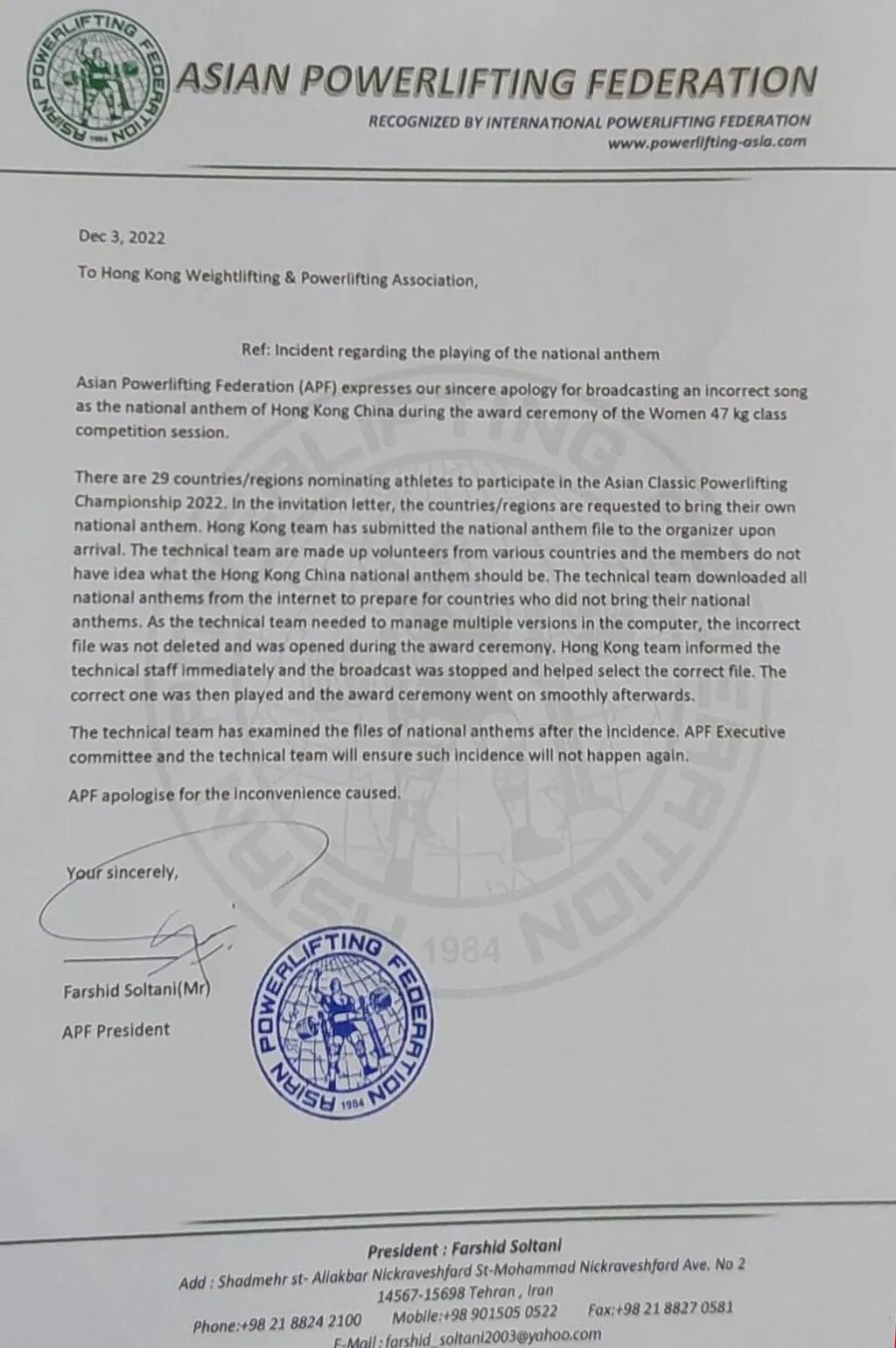 亞洲健力聯盟致函香港舉重健力總會,作出書面道歉。