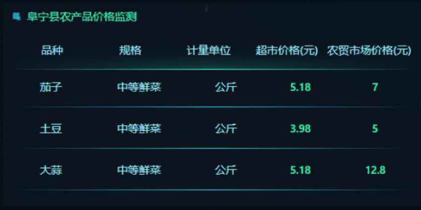 在农业市场大数据方面,平台可显示阜宁县及县内各乡镇家畜、家禽的出栏量和存栏量。同时,平台能够了解到政府网站最新一期发布的农产品品种、规格、价格数据。这些市场数据一方面能够指导生产者调整生产规模、帮助政府调整生产结构,促进农业增效生产者增收;另一方面,对于农产品期货市场也有重要的指导借鉴意义。