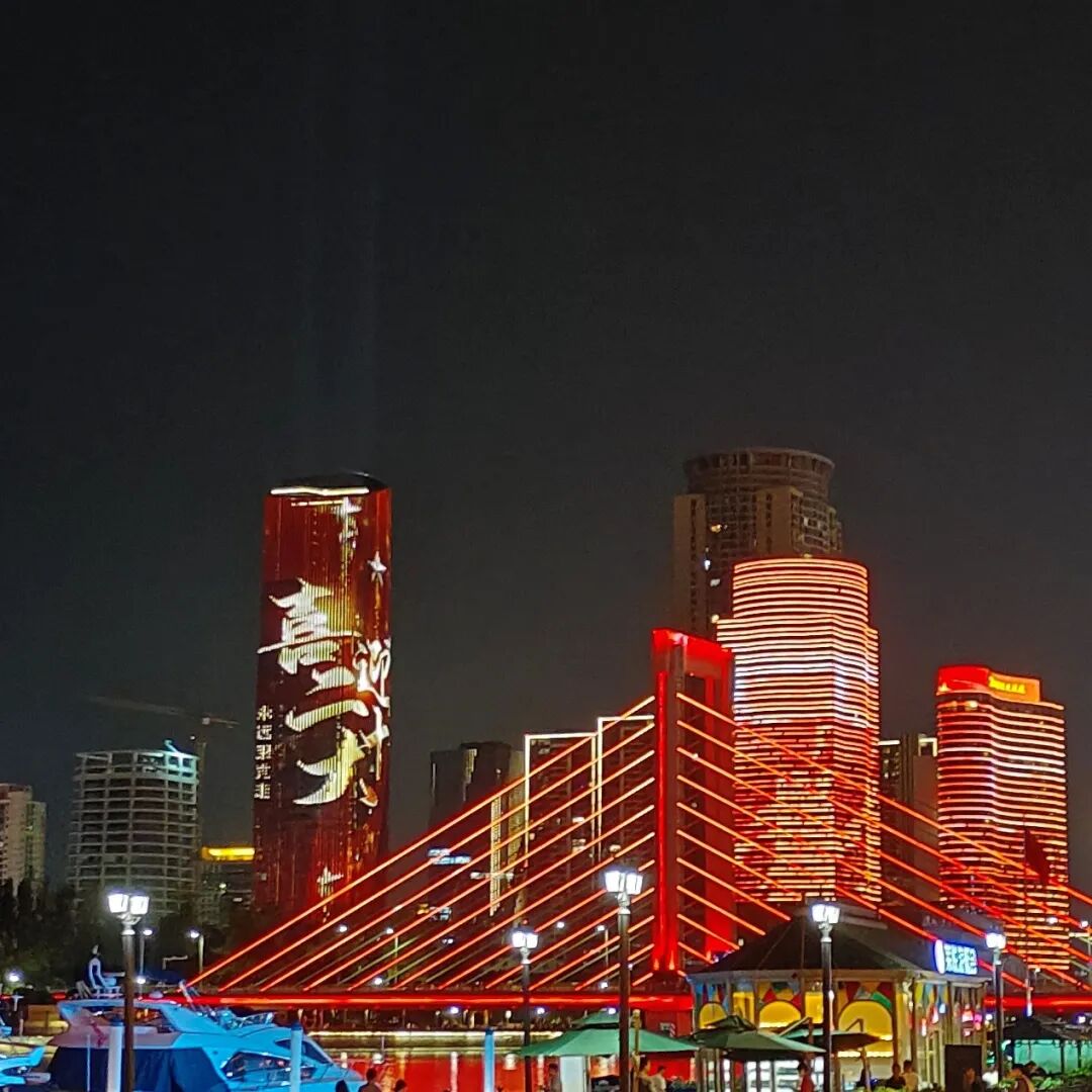 车水马龙的街头,江水奔涌的三江口。灯火辉煌,星月清辉与江水交融,宁波亮起灯火为祖国庆生,共祝祖国73岁华诞。远处的楼房上点亮五星红旗,外滩的夜人声鼎沸,千千万民众涌向街头,共道一声:祖国,生日快乐!