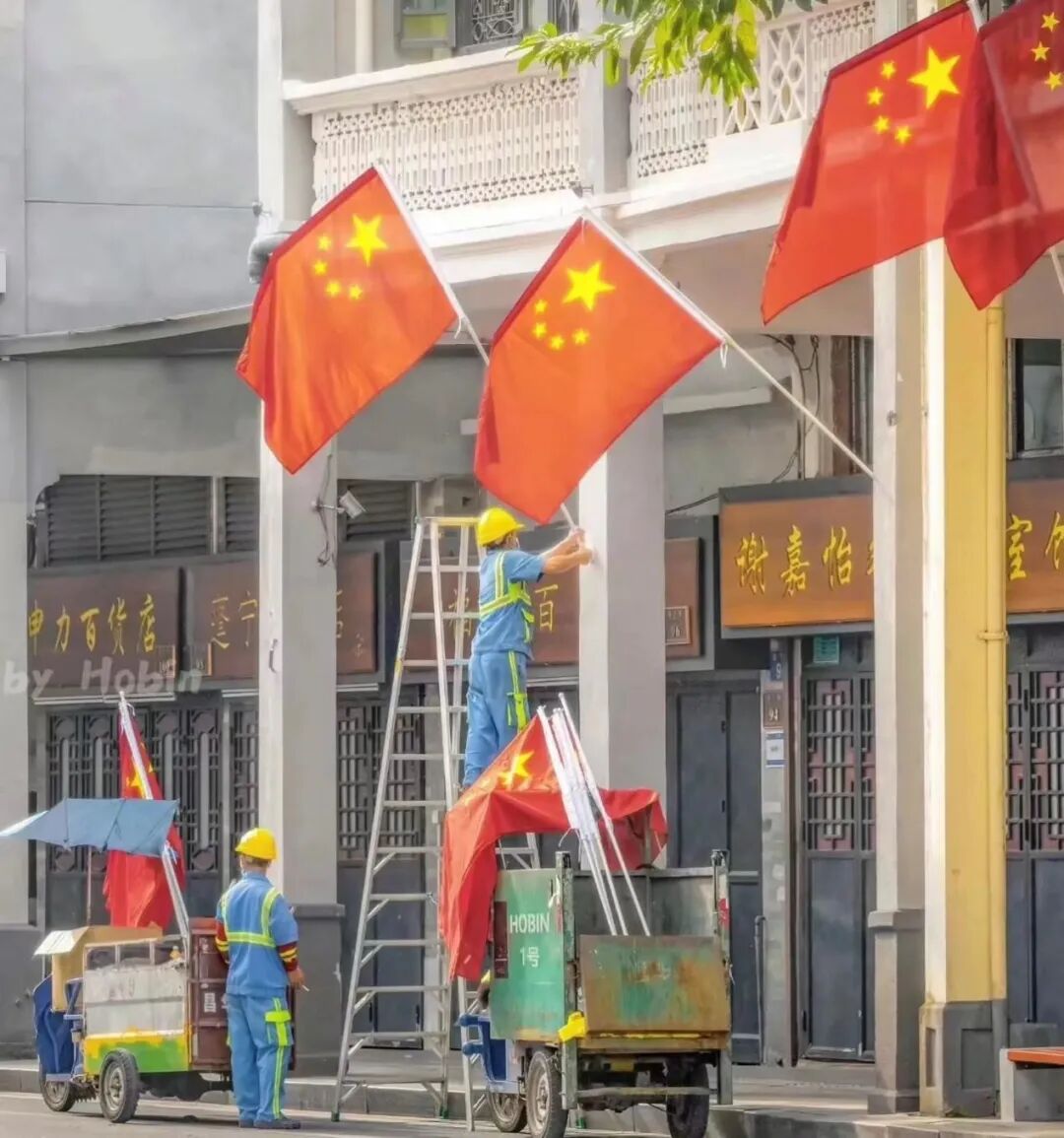 国庆当天风和日丽,路边插满了红色迎风飘扬的五星红旗,在阳光下熠熠生辉。工人们依旧努力地工作,但看着这些鲜红的旗帜,内心应该都是充满能量的吧!
