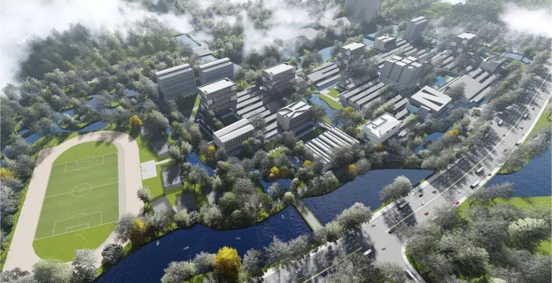 ▲浙江湖畔大学创业研究中心项目(一期)南面为余杭塘河,北面为宣杭铁路,东面为杭州师范大学新校区,西面为梦想小镇,总用地面积约为350亩。项目由教学、行政后勤、餐饮及停车配套等组成。