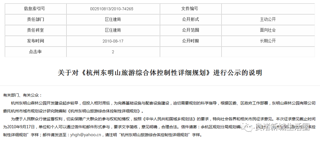 2010年8月,余杭区相关部门就发布了《杭州东明山旅游综合体控制性详细规划》