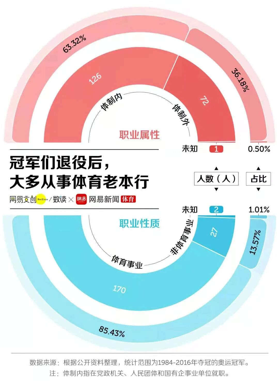 在职业领域这块,进入了体制内的冠军们就是家长眼中捧着金饭碗的别人家的孩子,有 93 位退役的奥运冠军任职过非教练的体制岗位。