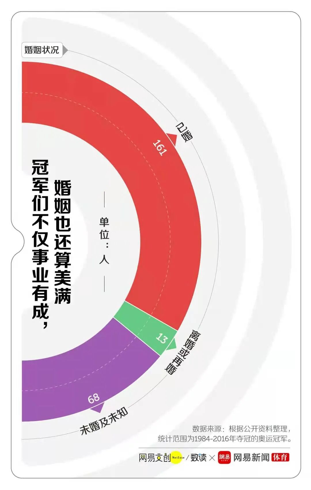 在已婚的这群人中,内部消化很常见。有 83 名冠军的另一半也和自己一样是运动员。所谓门当户对,或许就是在运动场上共同挥洒汗水时,双方一个默契的眼神就牵起了一段红线。