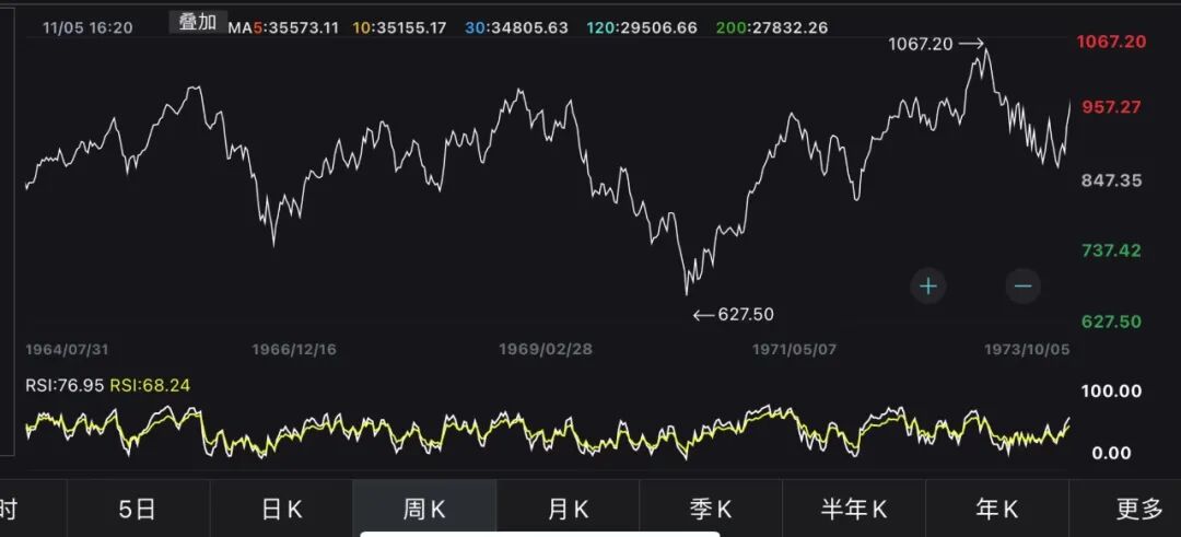 再看越南战争期间。1965年3月,美国政府派遣3500名海军陆战队员在越南岘港登陆,越南战争正式爆发。1973年1月,关于越南问题的四方在巴黎会谈并签署《巴黎和平条约》,在之后的几个月内美军逐步撤离越南。从1965到1973年,道琼斯指数上涨43%左右,平均每年上涨5%左右。