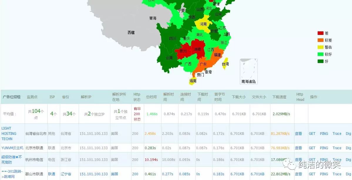 期间领导也开始动用各种关系,联通内部的朋友、网络运维界的大拿帮忙来定位解决,我们也尝试了很多的办法,比如,使用 ipconfig/flushdns命令清除本机的DNS缓存、在万网的官网把DNS解析重新更新一边、删除在重新添加等等,也不是完全没有收获。我们一直想找一个可以测试各个地方、运营商网络的办法,终于在各方推荐和搜索的情况下找了17ce 和 360奇云测两个网站,感觉非常实用,在以后的网络定位中,成了我必备使用的工具,可以非常方便的监控各个运营商、各个地区网站的访问是否通不通、访问的速度快不快等问题,截图如下: