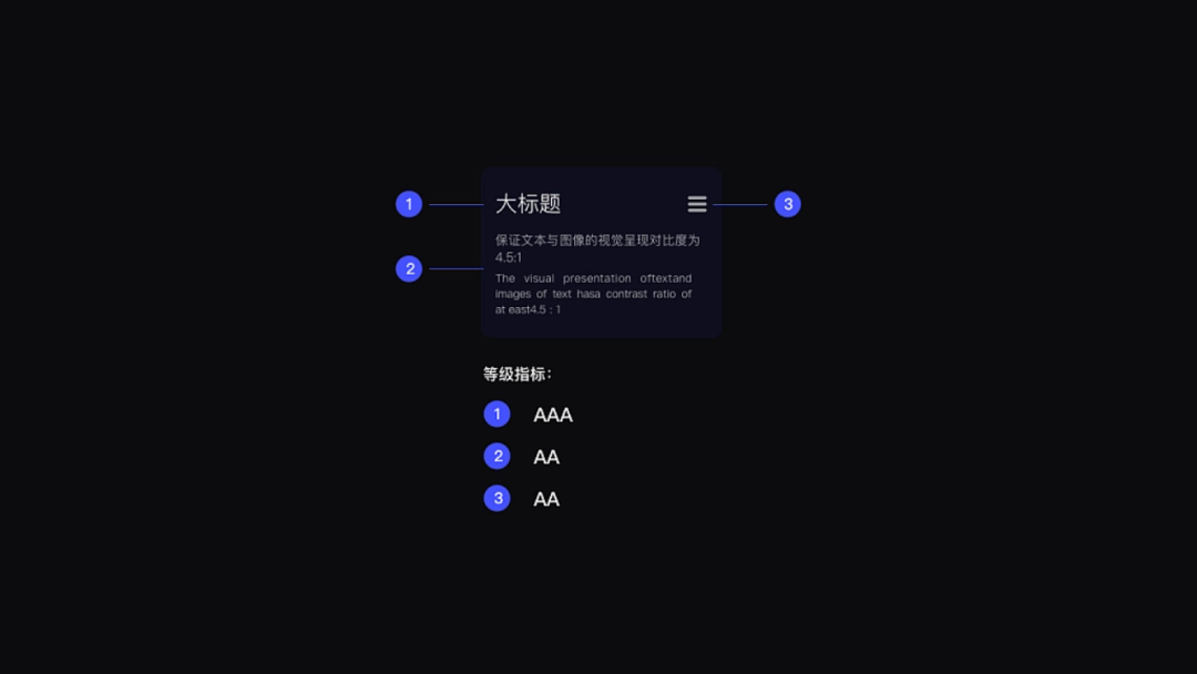 关于深色模式下的文字使用,老生常谈的就是对比度了,这里就要引入一个新的名词“WCAG”,WCAG全称为Web内容无障碍指南,其中包含分为可感知性、可操作性、可理解性、可兼容性和一致性五大类的相关建议。WCAG规定为了确保文字的可读性,对比度需要符合WCAG 的AA级 与 AAA级标准。WCAG 的AA级 要求小文本与背景的对比度至少为4.5:1,大文本与背景的对比度至少为3:1。WCAG 的 AAA级则要求小文本与背景的对比度至少为7:1,大文本与背景的对比度为4.5:1。
