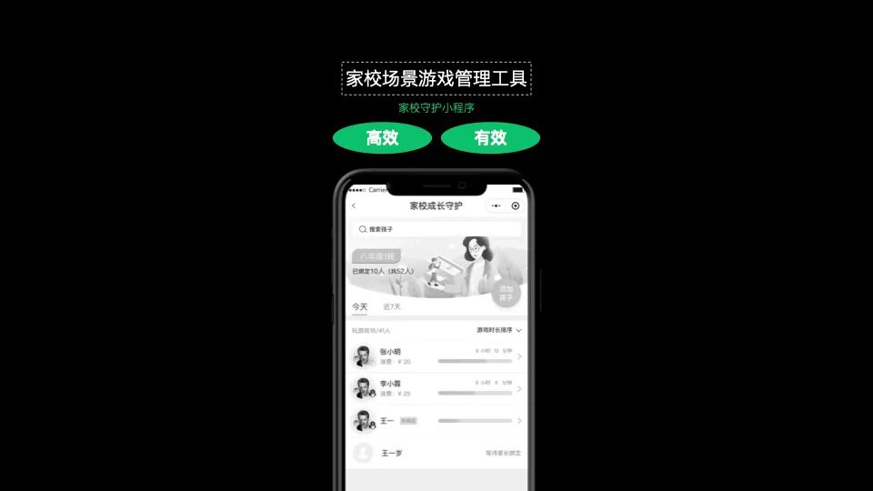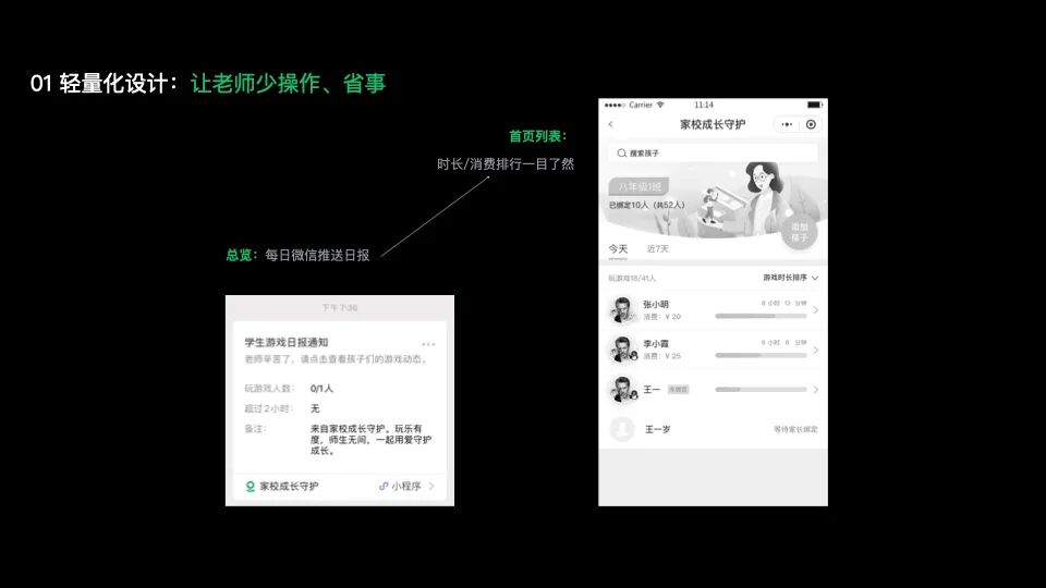 比如如下的一个小触点,家校守护小程序,它的定位就是一个尝试探索的辅助解决方案,在家校场景,让老师辅助来进行防沉迷管理。