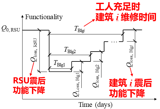 考虑到单栋建筑的功能占城市整体功能的比重较小,因此本研究忽略单体建筑在维修过程中的功能变化对恢复曲线的影响,认为单体建筑在达到其维修总时间时,一次性恢复其在地震中损失的全部功能。因此维修规划单元内的建筑依次完成维修时,其功能恢复曲线呈阶梯状(图8)。