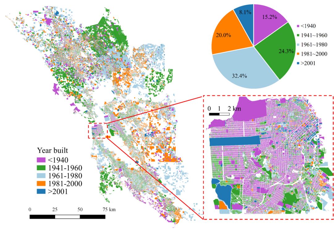 图7 旧金山湾区180万栋建筑建造年代分布