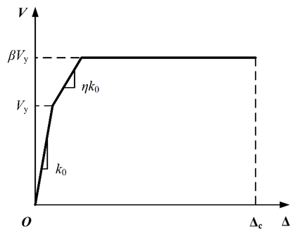 该模块基于城市抗震弹塑性分析方法对建筑分析模型进行参数标定。采用多自由度 (multiple degree-of-freedom, MDOF) 剪切层模型(如图2)对城市区域建筑进行模拟,该模型假设结构每一层的质量都集中在楼面上,认为楼板为刚性且忽略楼板的转动位移,因此可以将每一层简化成一个质点,不同楼层之间的质点通过剪切弹簧连接在一起。楼层之间剪切弹簧的力-变形关系如图3所示,其中骨架线采用HAZUS报告中推荐的三线性骨架线,如图3(a)所示。层间滞回模型采用如图3(b)所示的单参数滞回模型(Steelman & Hajjar, 2009)。