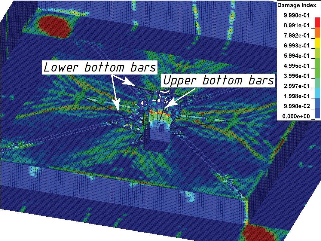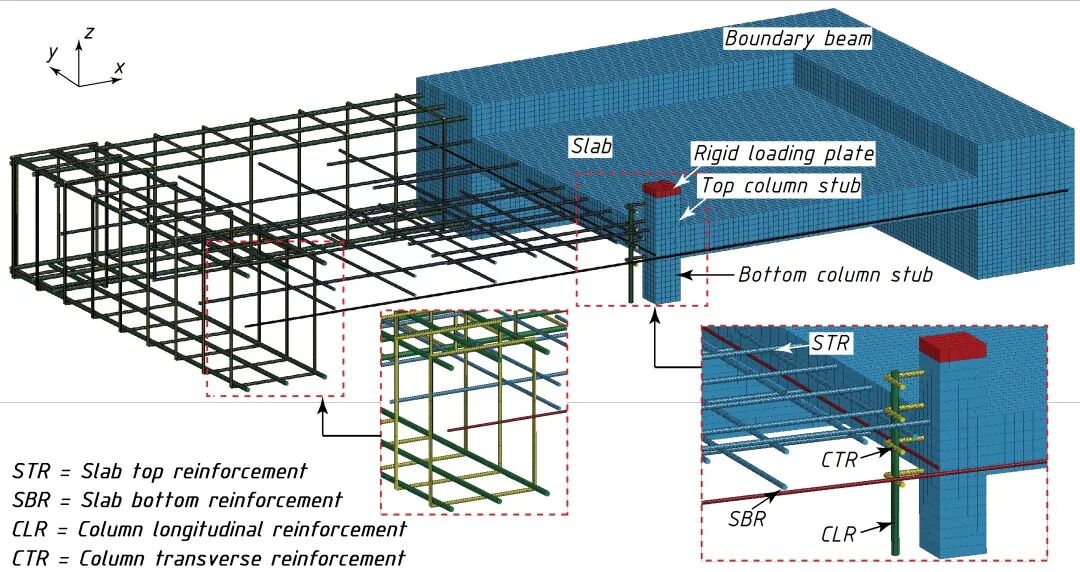 本文主要模拟了在清华大学进行的一系列板柱节点冲切后承载力试验(图 2)。试验中板柱节点支撑在四周的边界梁上,并在中间柱头上受到逐渐施加的竖向位移。建模过程中采用分离式方法,使用2节点梁单元模拟钢筋及8节点实体单元模拟混凝土,并通过*CONSTRAINED_BEAM_IN_SOLID关键字将二者相耦合。建模时将各层钢筋排布于其实际位置并通过*CONTACT_AUTOMATIC_GENERAL关键字施加钢筋单元间的接触,这样使得板柱节点冲切破坏后的悬挂效应得以较好地模拟。