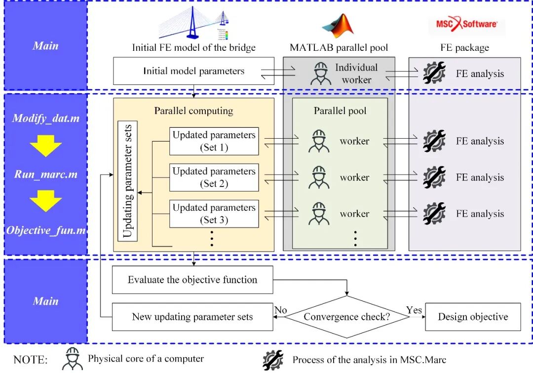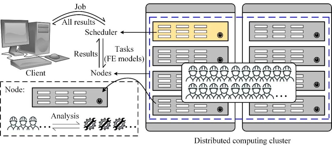 本文采用遗传算法作为更新算法,计算时,每一代种群的个体都是一个包含独立参数的有限元模型,将每一代种群中个体模型的有限元分析工作采用并行的方式分配给不同CPU核心计算,以提高程序计算效率。同时,采用5台Intel Xeon E5-2670 v3 @2.30GHz双路CPU服务器搭建一个包含115个核心的计算集群,基于MATLAB编写相应的集群计算程序,进一步提升程序计算效率,如图5-6所示,相关部分程序代码可以查阅原文。